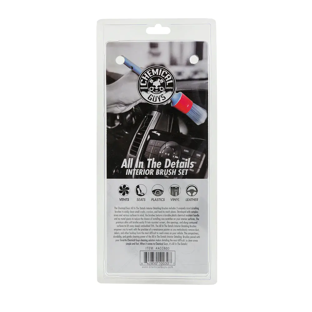 All in the Details Interior Detailing Brushes use premium boar and synthetic bristles to dislodge tough grime without scratching sensitive surfaces. - Ideal for agitating dirt, dusting surfaces, scrubbing wet areas, and cleaning tight paces