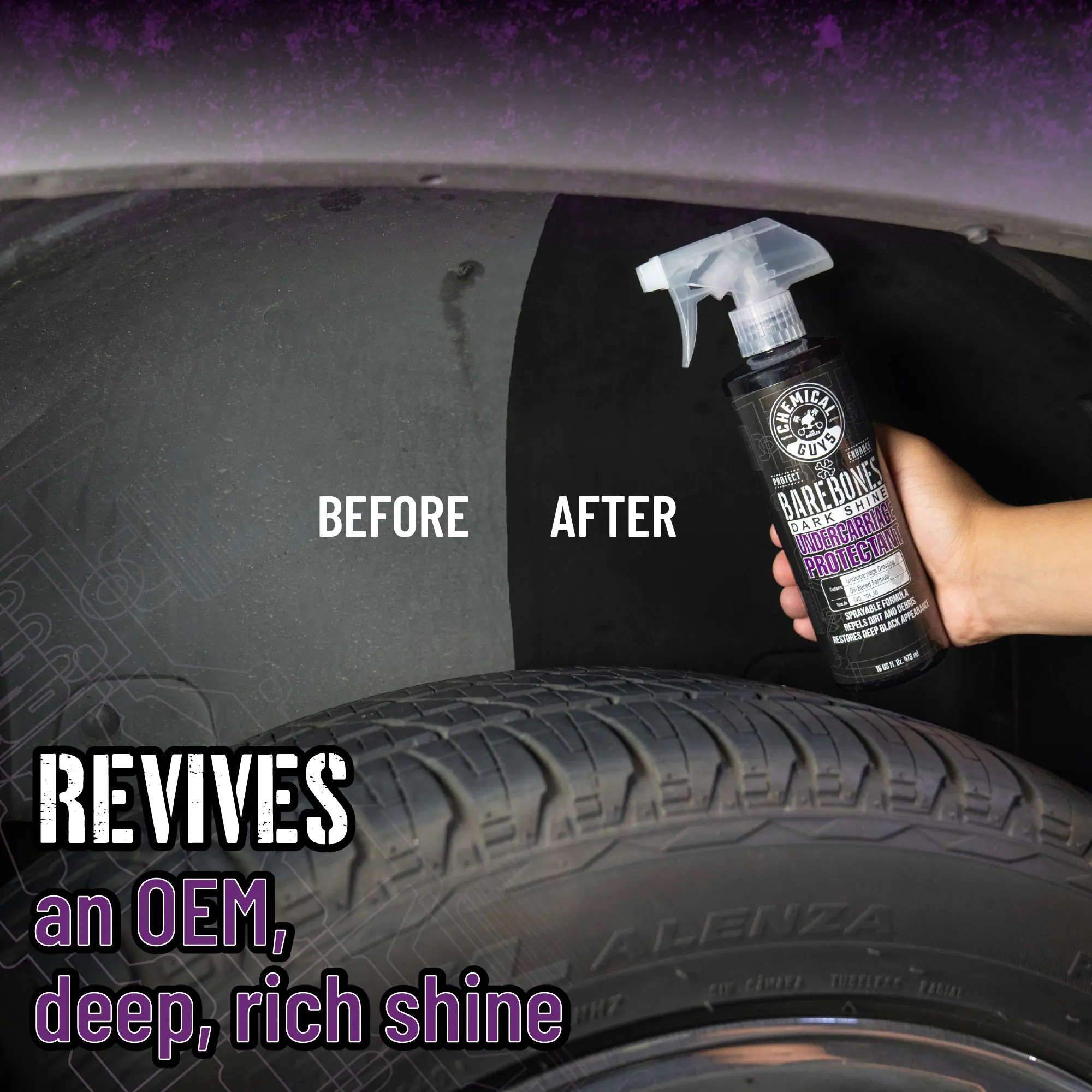 The oil-based dressing restores faded undercarriage and trim surfaces back to like-new condition. The sprayable dressing is designed for undercarriages, wheel wells, subframes, springs, suspension components, fender liners, and bumper covers. Bare Bones uses premium ingredients that finish with a dry-to-the-touch feel within minutes for easy application on virtually any vehicle.
