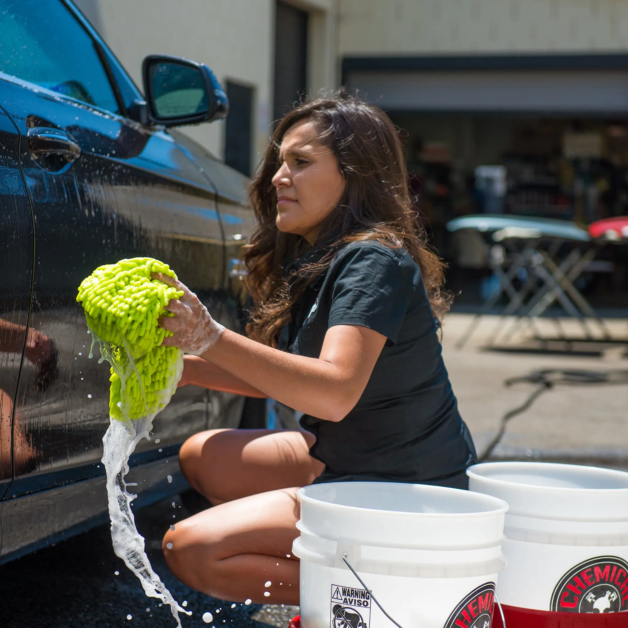The Chenille Wash Pad’s fluffy woven fabric noodles increase the surface area tremendously—one pad holds as much soapy water and dirt as two and a half flat microfiber wash mitts! Every strand works by trapping abrasive dirt deep within the pile, insulating abrasive filth from sensitive paintwork and reducing the chances of swirls after drying.