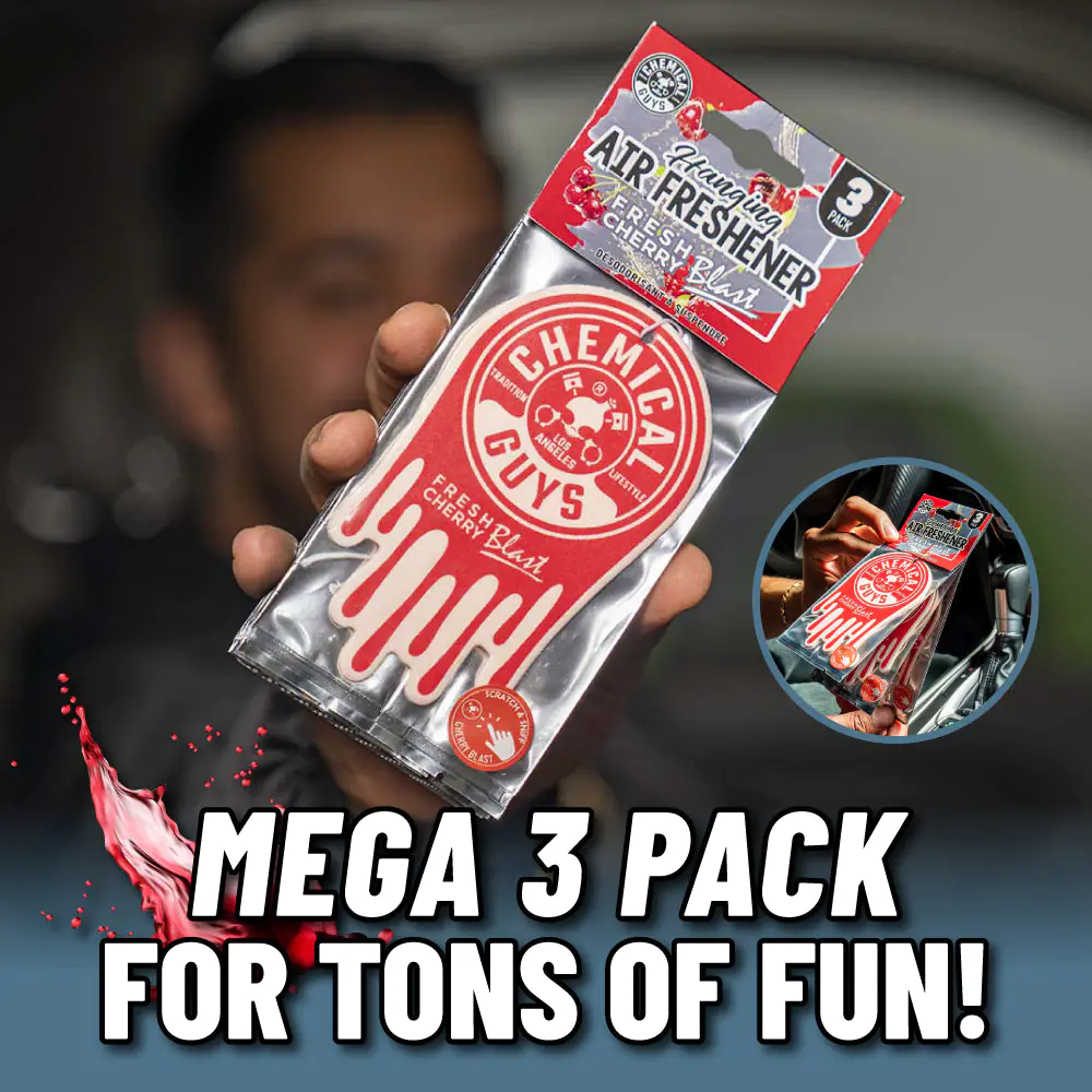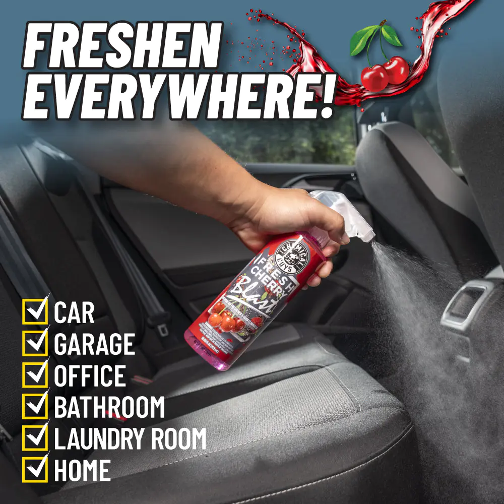 Fill your ride’s interior with the sweet, juicy scent of sun-ripened cherries with Chemical Guys Cherry Blast Air Freshener. This delectable scent is the perfect thing to turn virtually any space into a sweet-smelling escape. Enhance your interior with a trio of hanging air fresheners that add swagger while delivering just the right amount of that delicious cherry scent – perfect for cars, trucks, SUVs, and RVs. The versatile 16 oz spray is ready to freshen up your car, home, or office, and bring the delicious scent of fresh cherries anywhere you crave it!