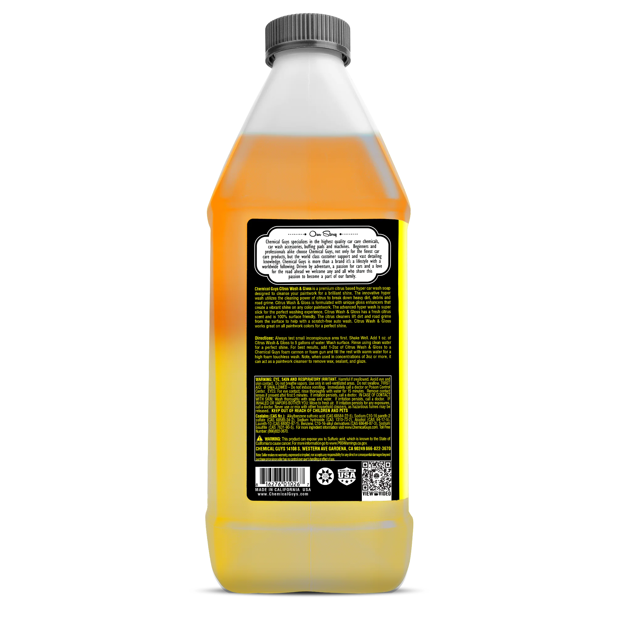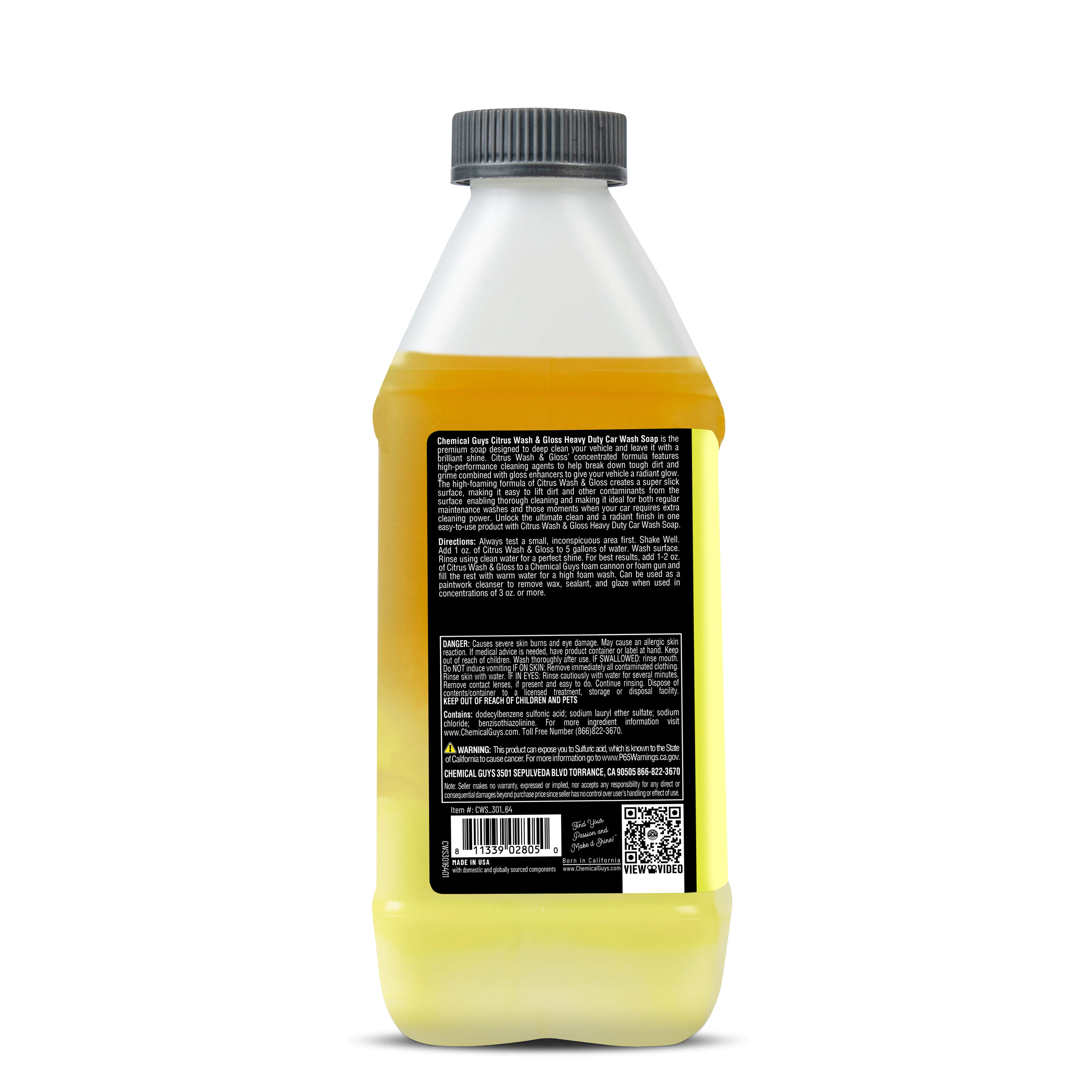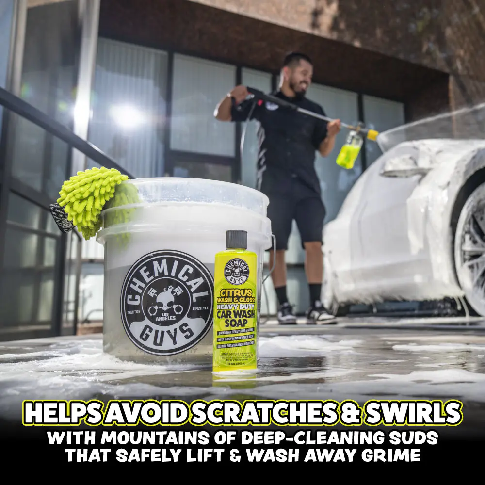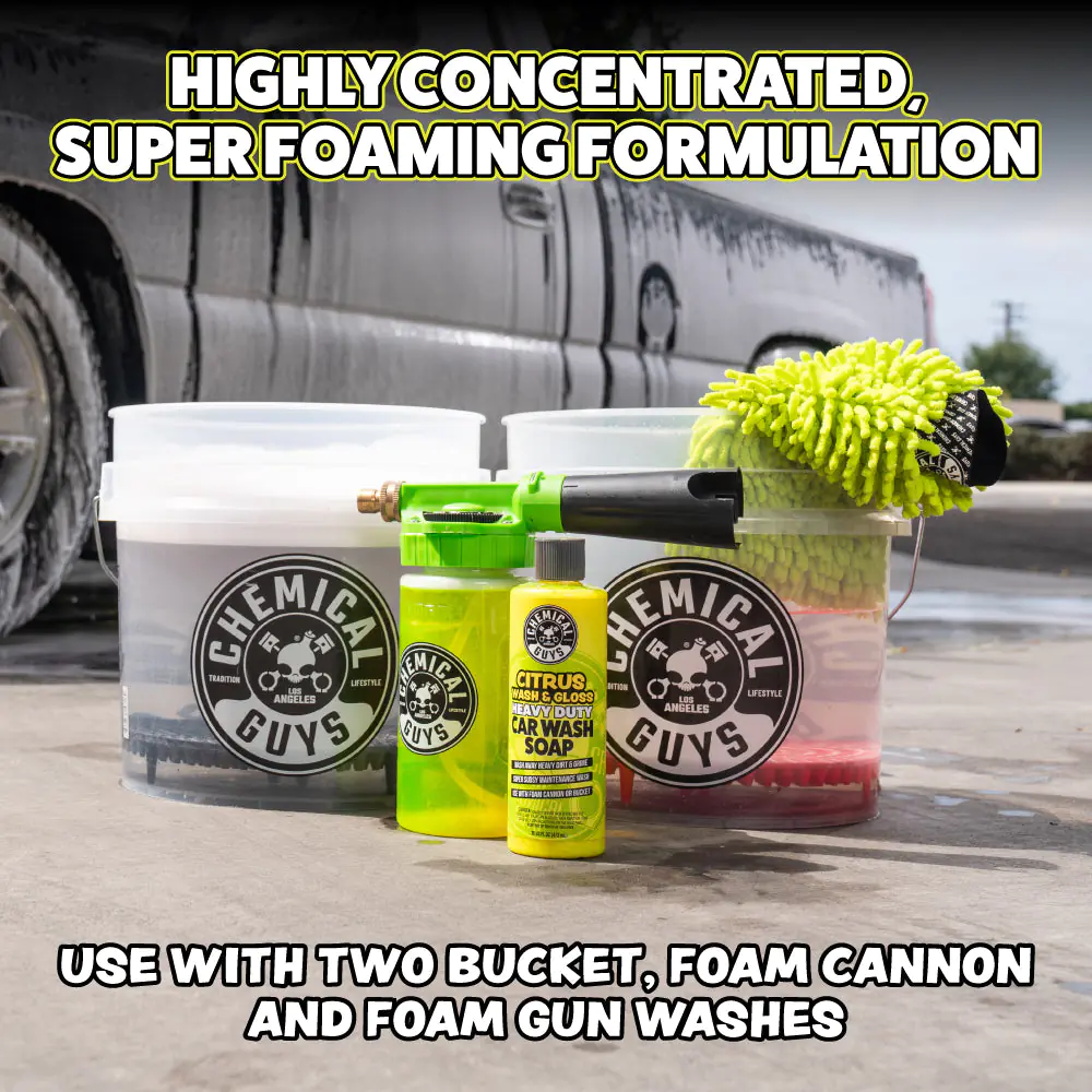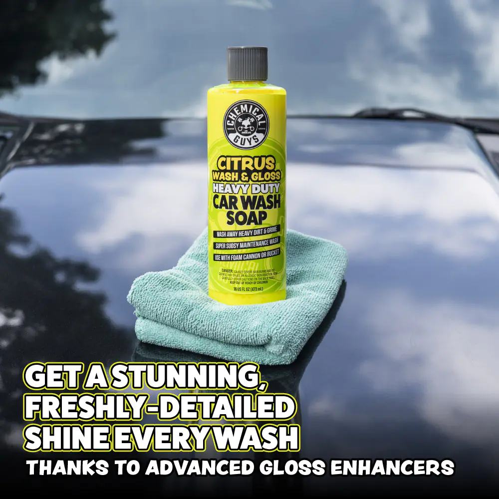 Bring out a vibrant, just-detailed shine every time you wash with Chemical Guys Citrus Wash & Gloss Car Wash Shampoo from Chemical Guys. This hyper-concentrated car shampoo uses the natural cleaning power of citrus extracts to quickly break down heavy dirt, road film, and grime while remaining safe for all paint colors. Rich, slick suds help your wash mitt glide smoothly across the surface to reduce swirl marks and scratches during washing. As it cleans, built-in gloss enhancers boost depth, clarity, and shine, leaving your paint with a freshly waxed look. The result is a powerful yet safe wash that lifts contaminants, restores vibrant color, and delivers a streak-free, high-gloss finish that makes any vehicle stand out.