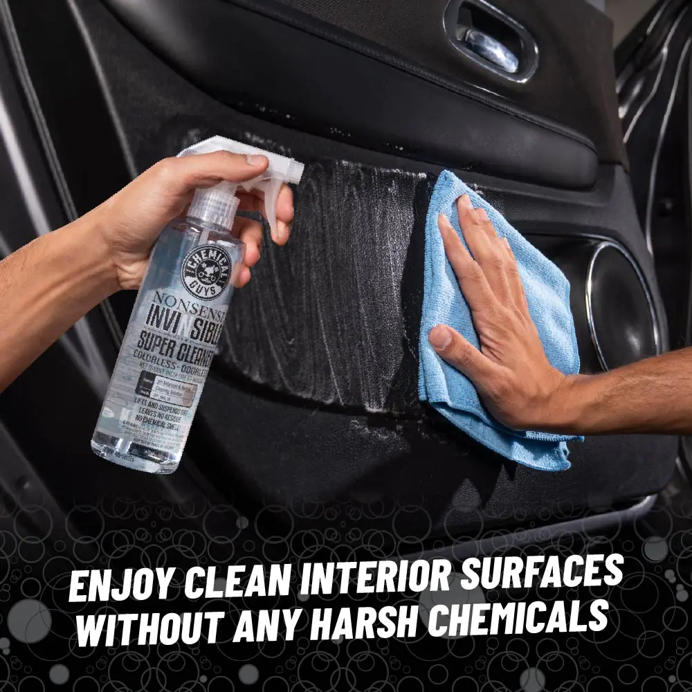 Nonsense All Purpose Cleaner and the Boar’s Hair Detailing Brush work together to deep clean door panels, carpets, dashboards, seats, steering wheels, center consoles, and more. Use the included Workhorse Microfiber Towels to leave surfaces with a residue-free finish.