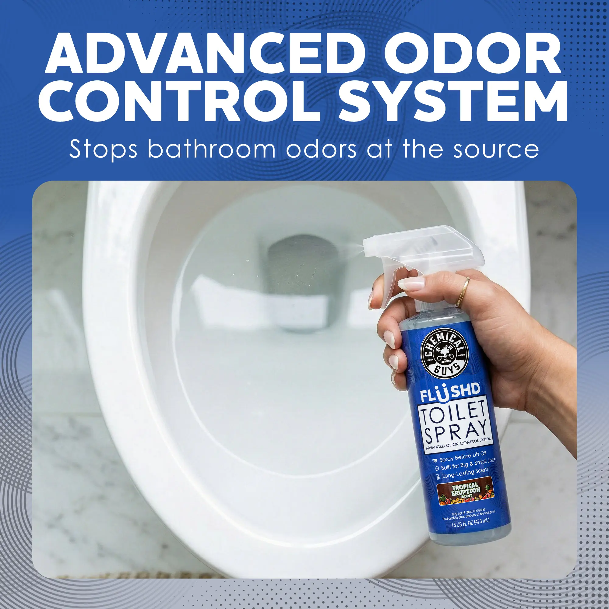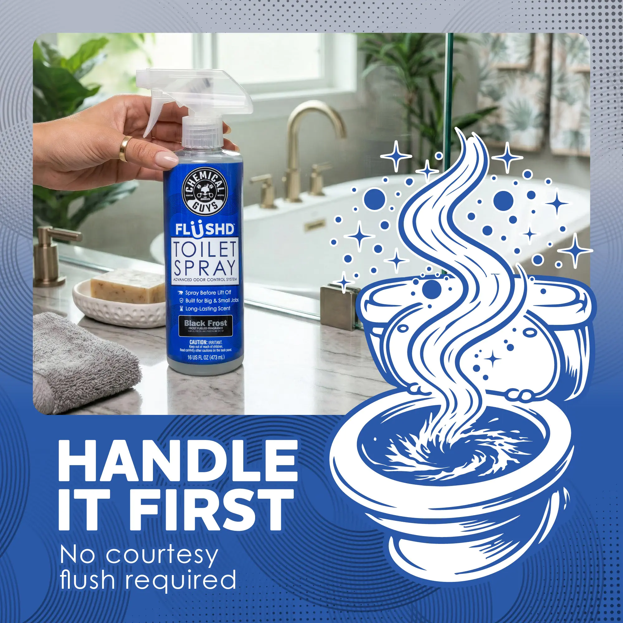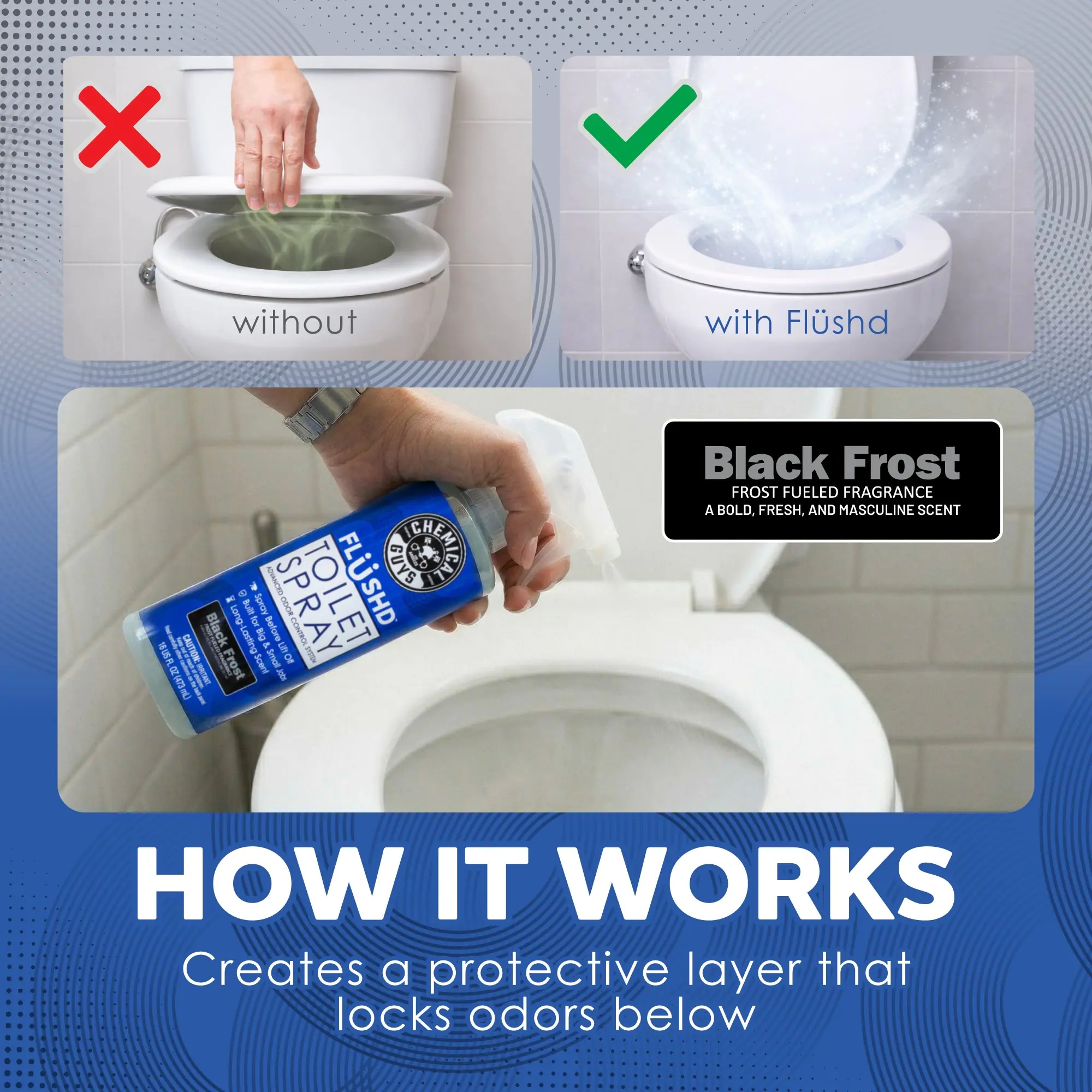Flüshd is a pre-use toilet spray built to handle the situation before it starts. This pre-use odor control system is designed to be used before the situation happens. All you do is spray first and Flüshd contains odors under the water’s surface. Spray directly into the toilet bowl water to create a containment layer that traps odors at the source—where they belong.