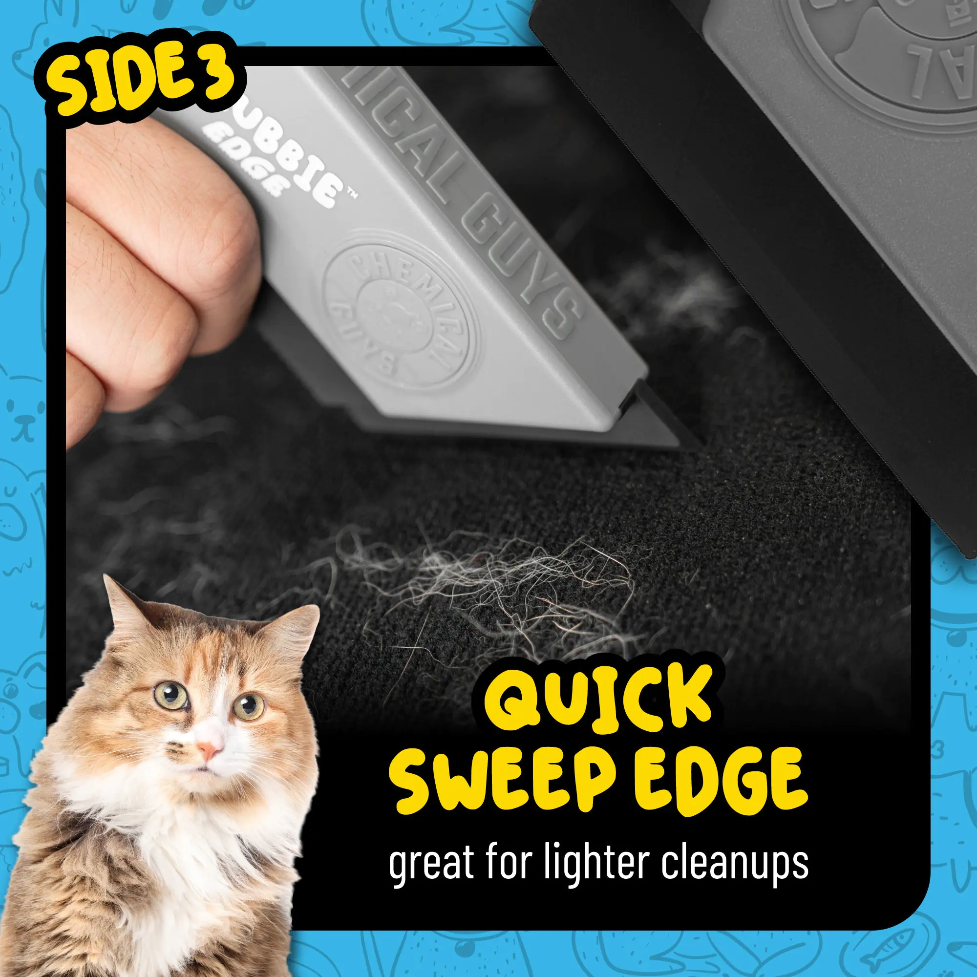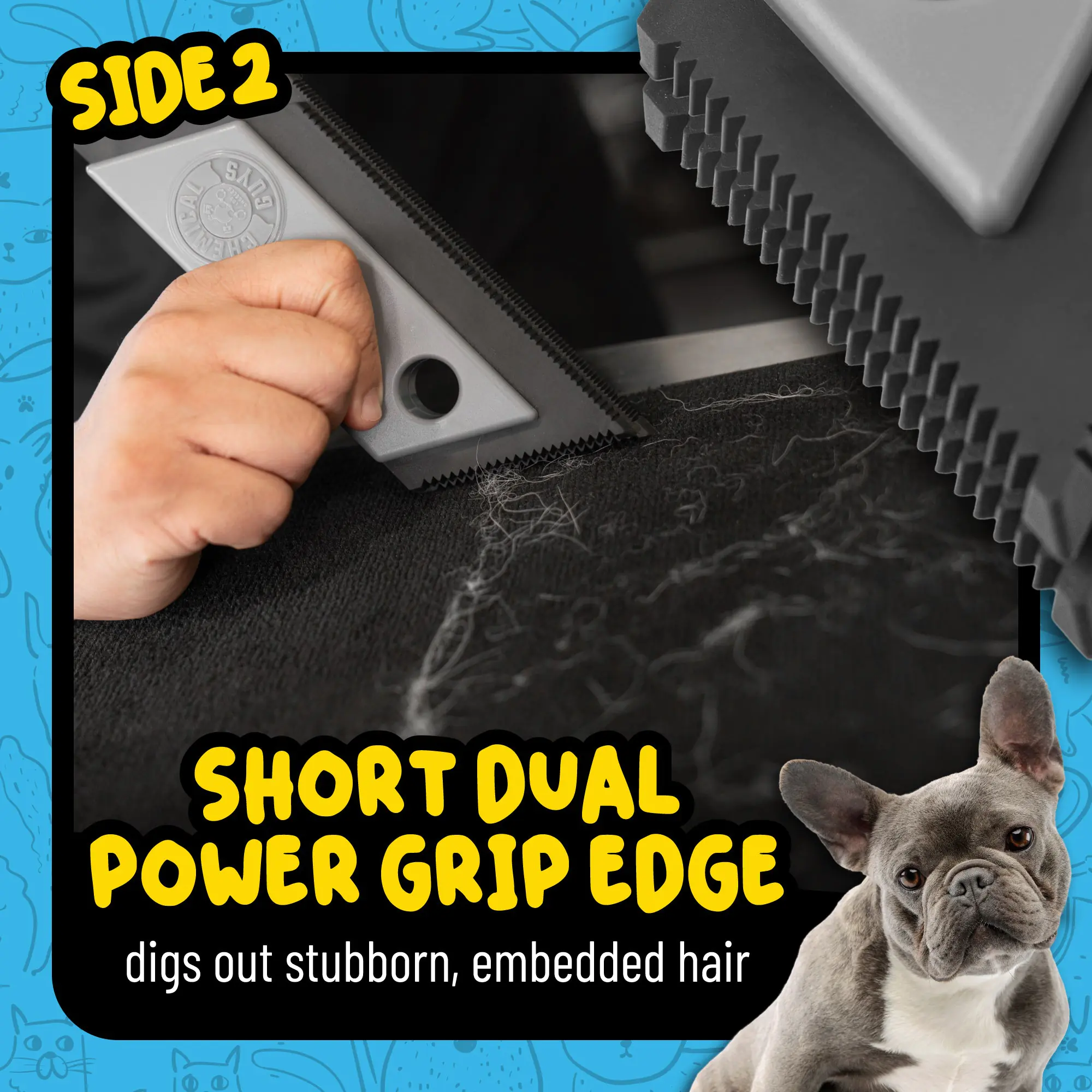 The Long Dual Micro Grip Edge is designed to sweep up loose pet hair quickly from larger surfaces such as seats, carpets, mats, couches, and bedding. For hair that is embedded deeper into fabric fibers and textured areas, the Short Dual Power Grip Edge digs in to help pull out stubborn fur and debris that can be difficult to remove. To finish the job, the Quick Sweep Edge is designed to reach into seams, cracks, corners, and tight spots where pet hair hides, and traditional tools often struggle to reach.