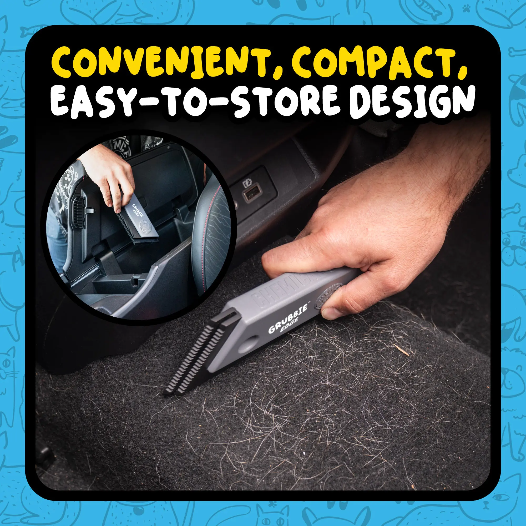 Any pet owner knows that pet fur can get virtually anywhere, including seats, carpets, and furniture, where it can work its way deep into fabric fibers, seams, and corners. Grubbie Edge is designed to address these different types of pet hair buildup with three distinct cleaning edges in one compact tool. Grubbie Edge’s unique design helps lift, pull, and collect pet hair from a variety of surfaces that fur tends to accumulate on.