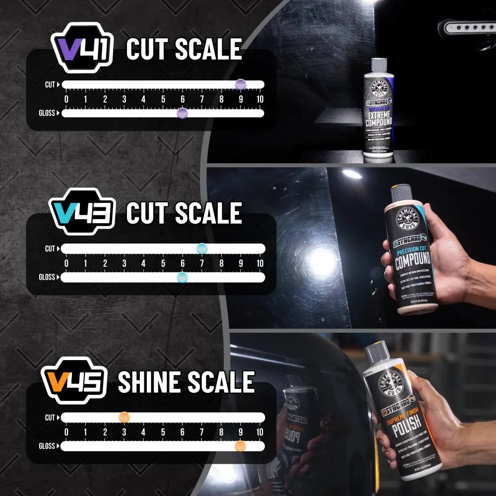 Regardless of your paint’s condition, you’ll have just what you need to get it looking its best. V41 Supreme Cut Extreme Compound’s powerful formula corrects heavy scratches and imperfections. V43 Precision Cut Compound tackles less severe scratches, swirls, and oxidation, restoring your paint to a near-perfect finish. Follow up with the V45 Finishing Polish for a deep, reflective gloss that makes your car look showroom ready.