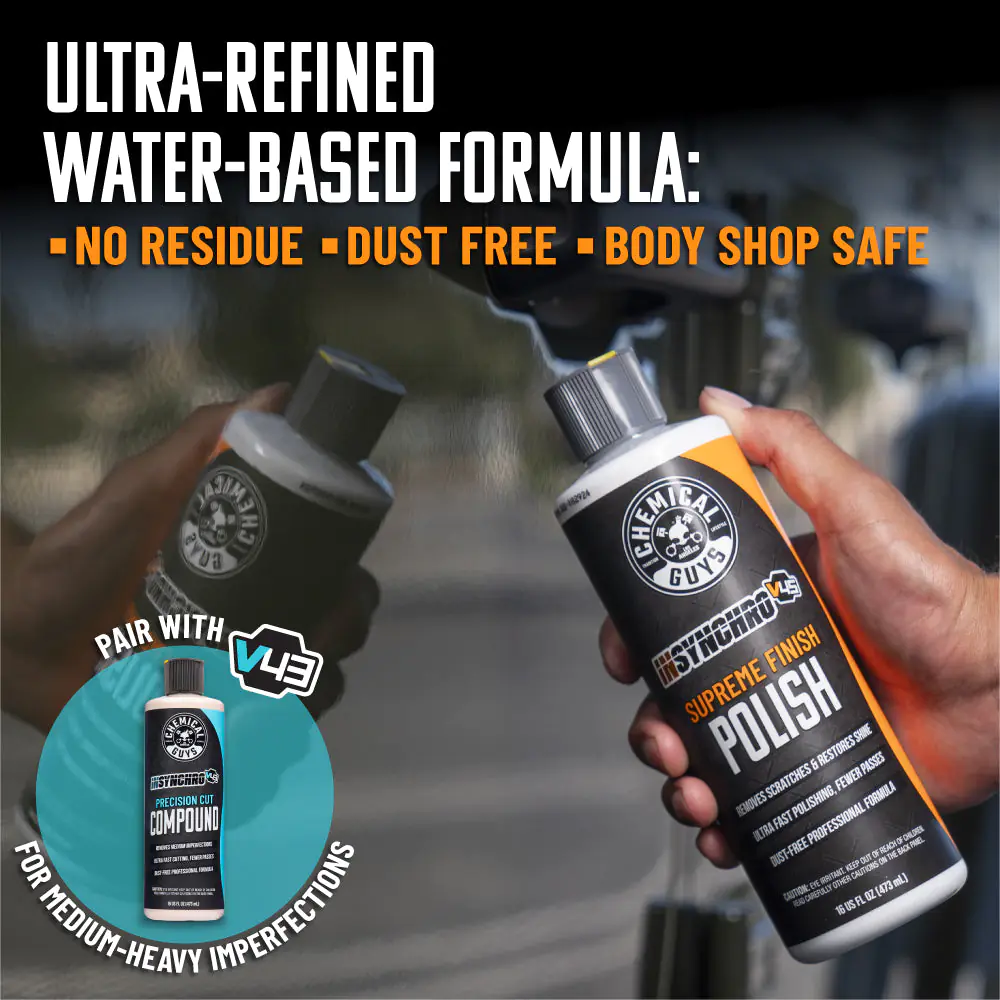 InSynchro V45 finishing polish can be used at home or in a body shop with dual-action and rotary polishers. Its ultra-refined, water-based formula produces virtually no dust or residue, ensuring a cleaner application process and higher-quality results for a superior, deep, glossy shine every time. Pair with Hex-Logic White Polishing Pads for superior results. Can also be applied with a hand pad.