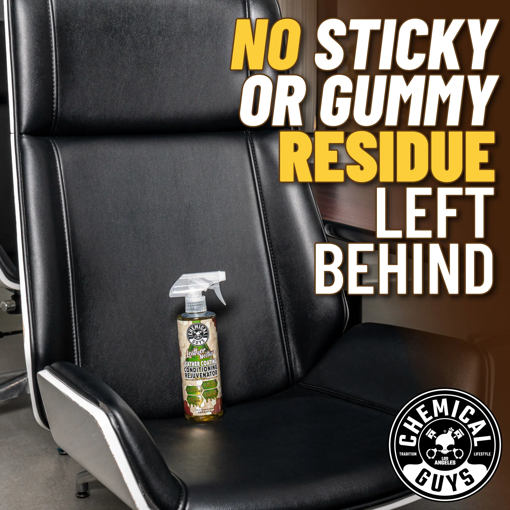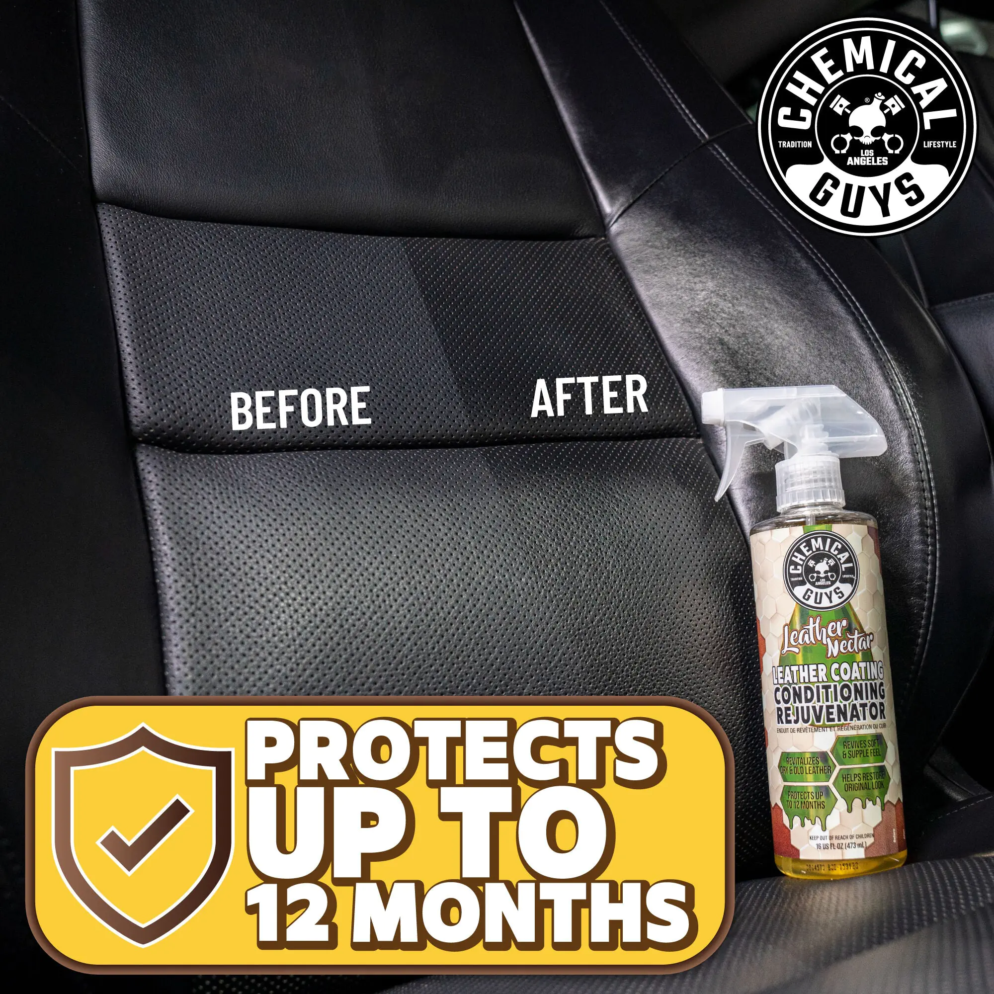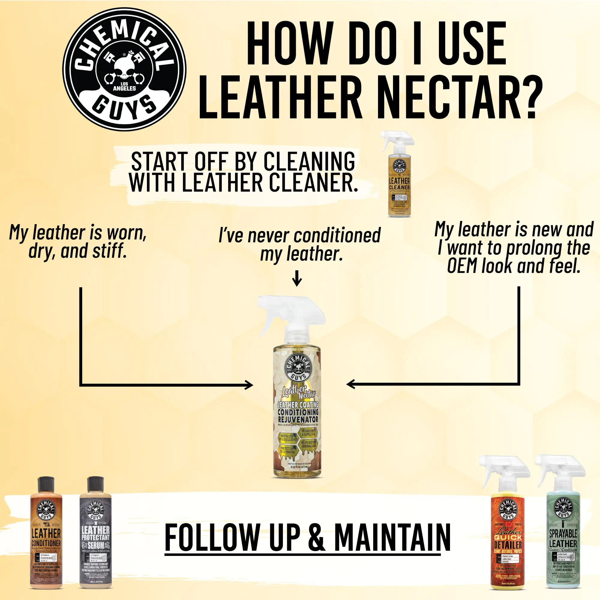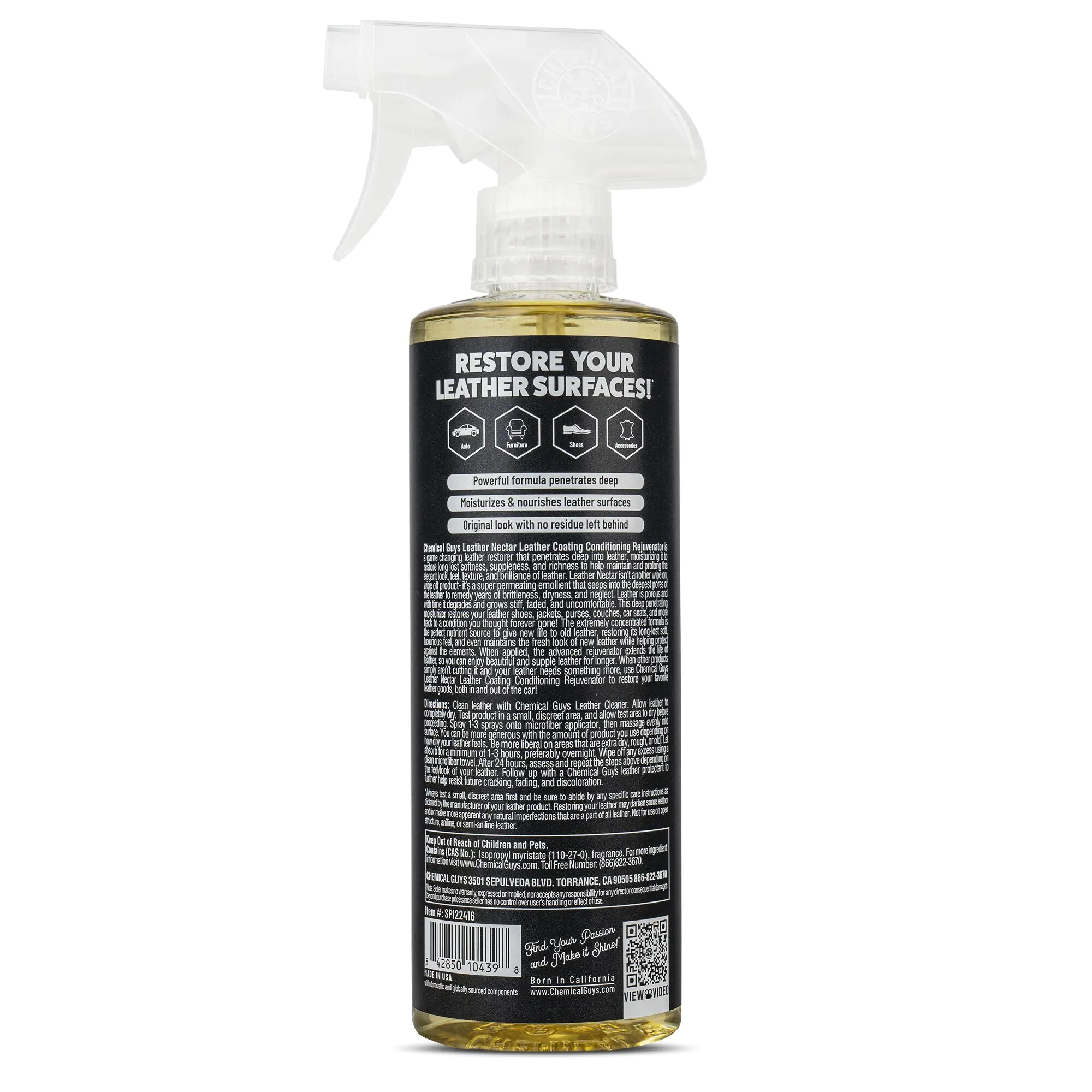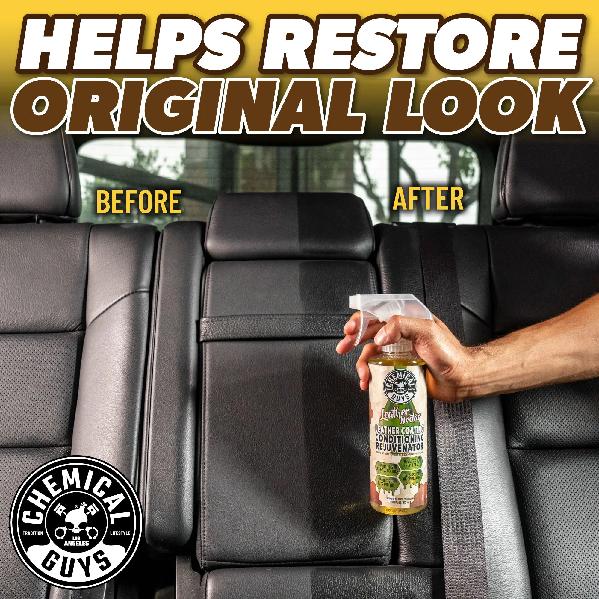 Chemical Guys Leather Nectar Leather Coating Conditioning Rejuvenator is a powerful leather restorer that penetrates deep into the pores of leather, moisturizing it to restore long lost softness, suppleness, and richness to help maintain and prolong the elegant look, feel, texture, and brilliance of leather.