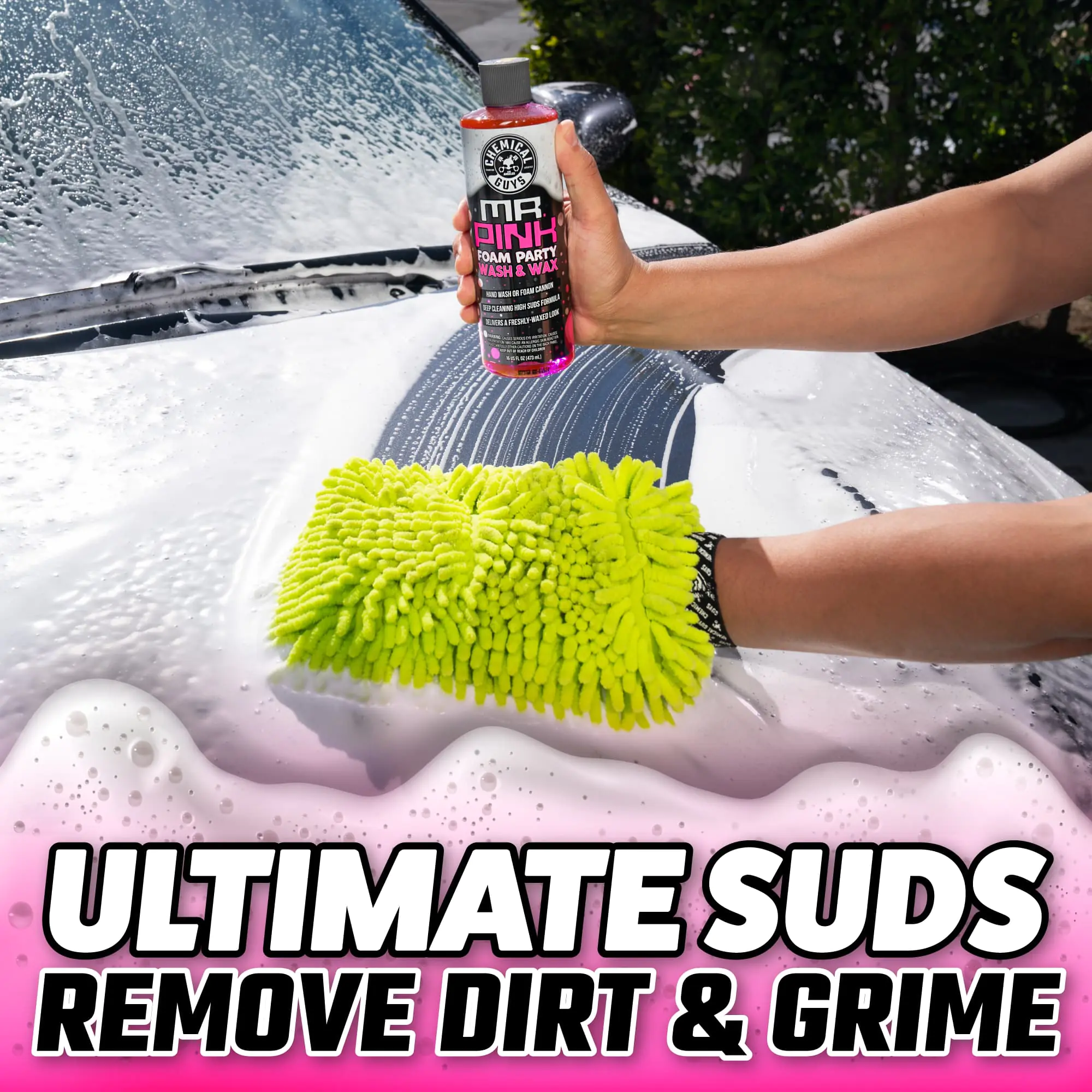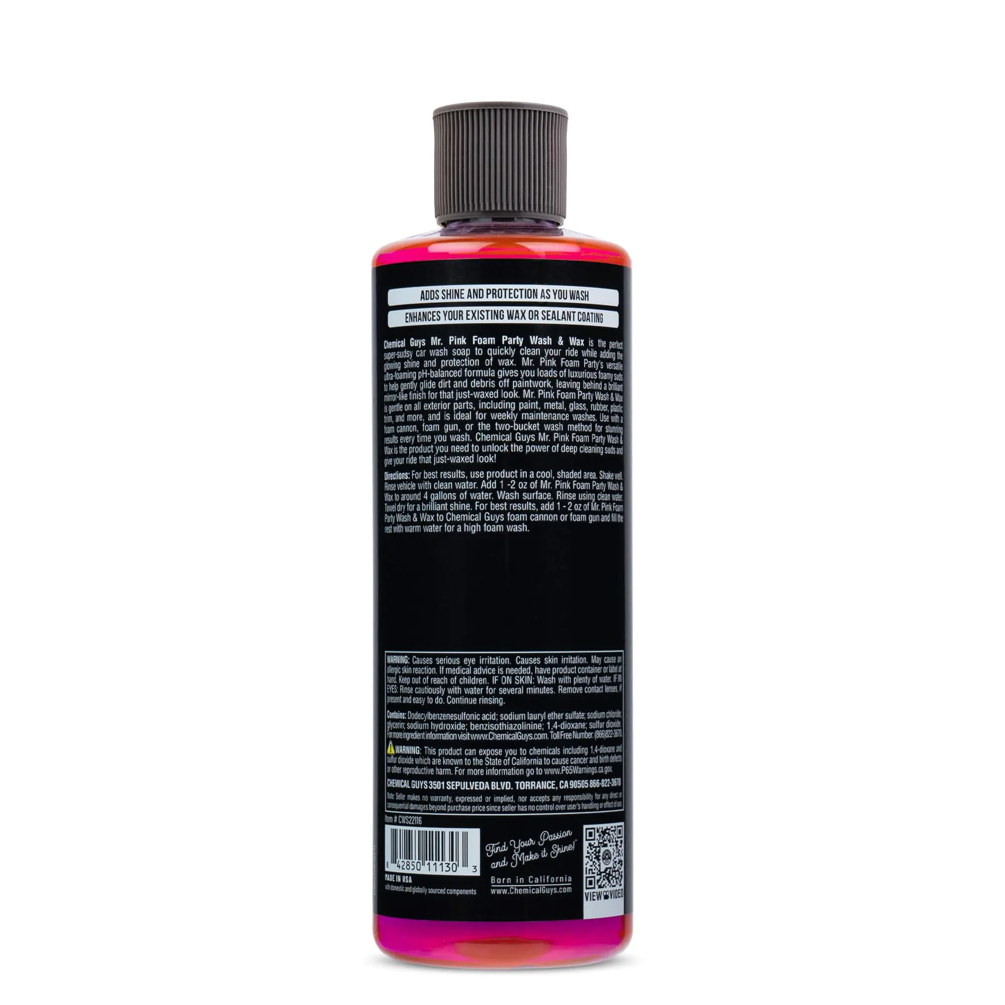 Mr. Pink Foam Party contains powerful hyper-surfactants that create billions of scrubbing bubbles to cut through dirt and grime while lifting and guiding them from sensitive automotive paintwork. The ultra-foamy, fluffy formula rinses clean with no residue and also contains water softeners to help reduce hard water spots. Finally, professional-grade wax polymers leave behind a protective coating that helps protect your car’s paintwork from dirt, grime, and the elements while providing a brilliant shine that lasts for weeks.