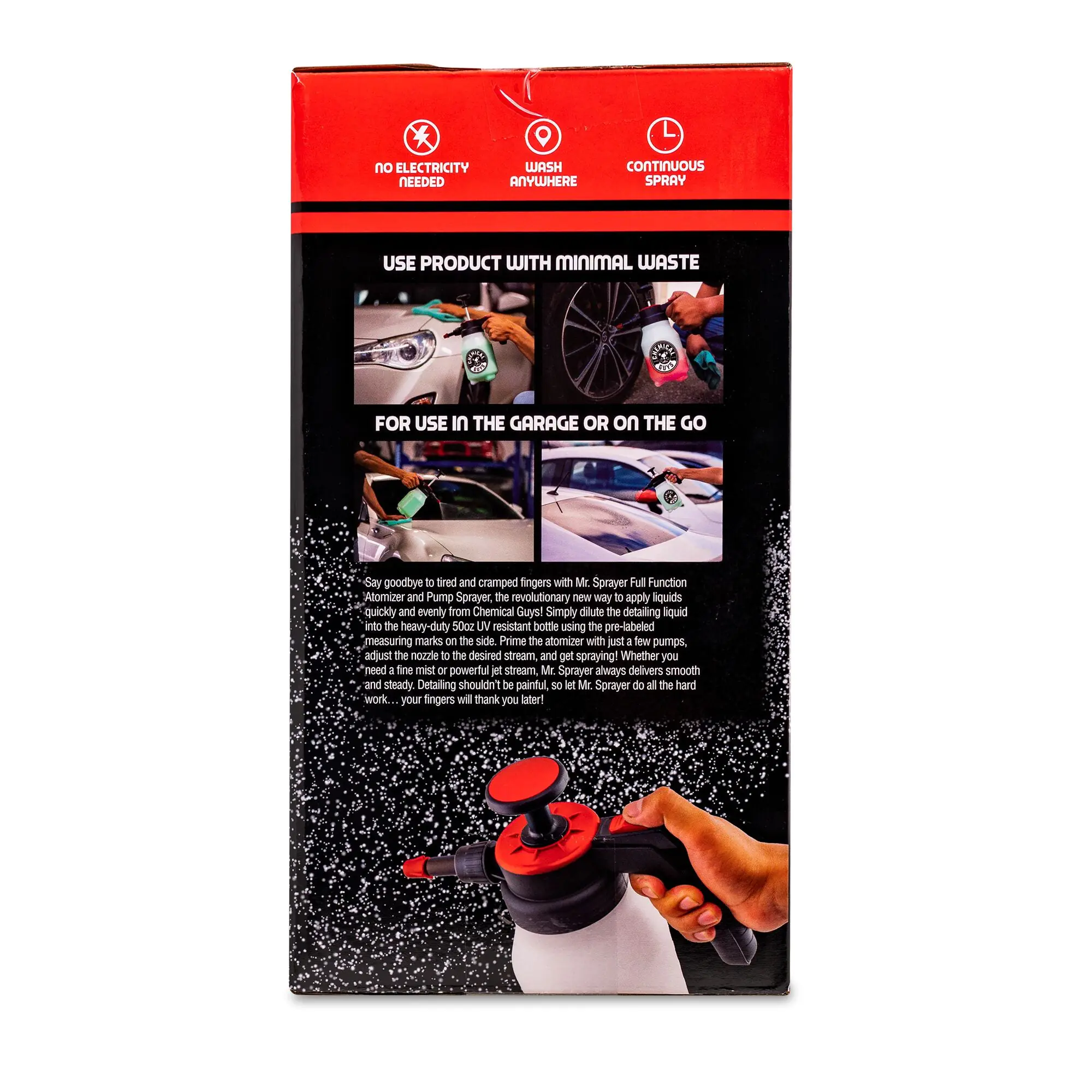 Mr. Sprayer is the revolutionary new way to apply detailing liquids without water hoses, buckets, power cords, or even tiring out your fingers. Just prime, point, and shoot a fine mist of product onto your vehicle.