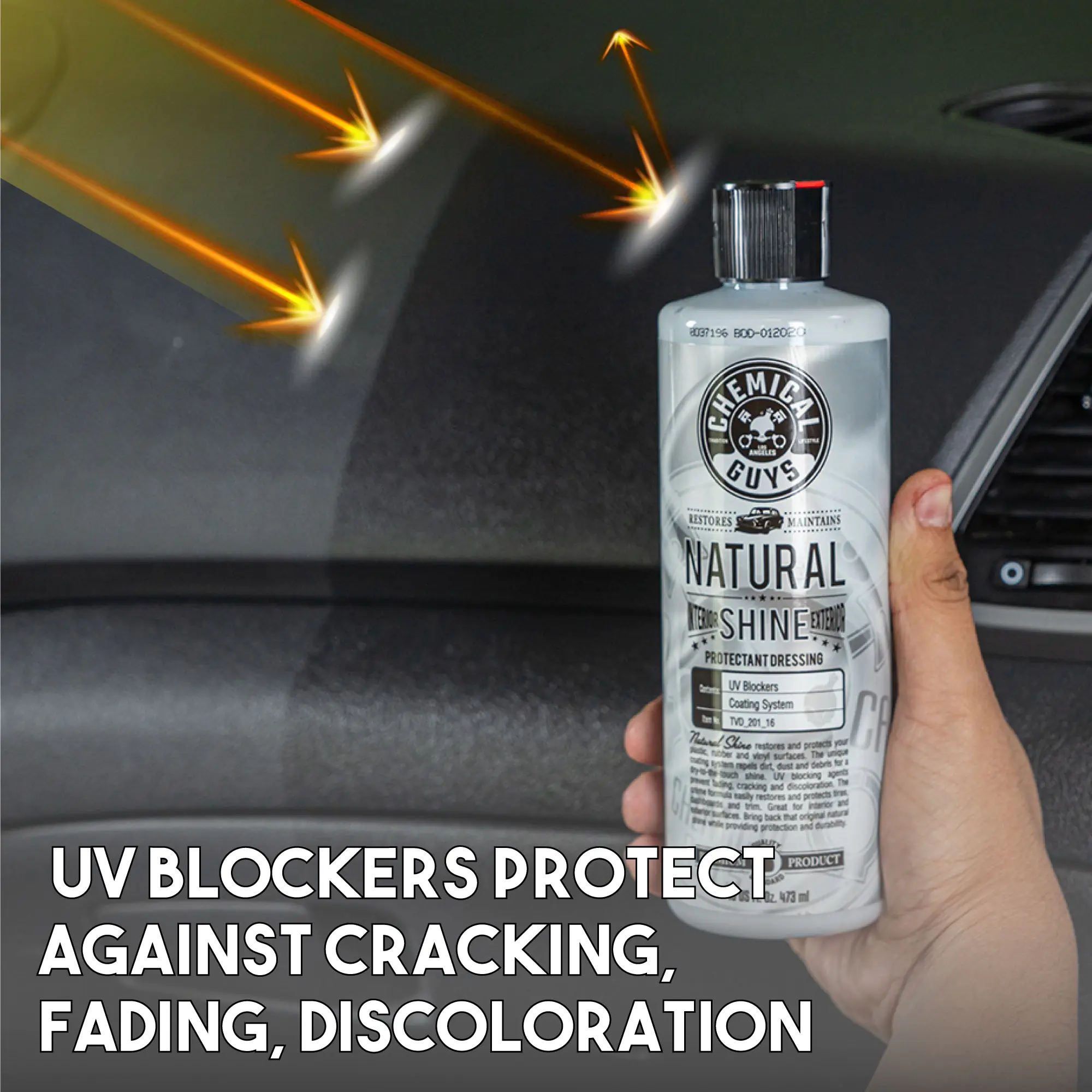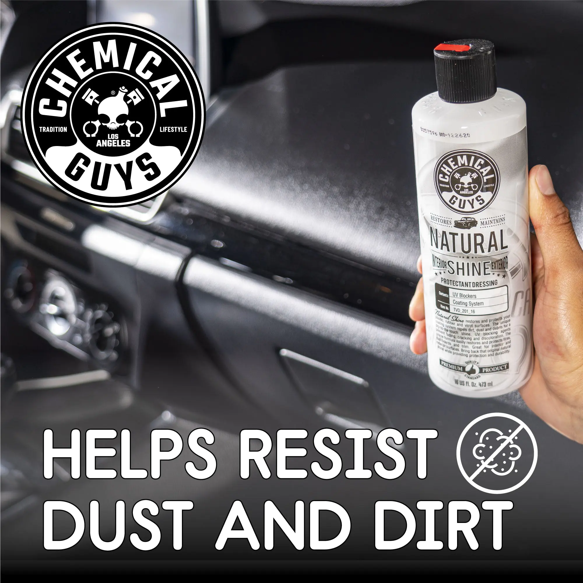 Natural Shine is a premium dressing that uses synthetic polymer coating technology to restore a classic, low-sheen, dry-to-the-touch shine to your plastic, rubber, and vinyl surfaces. Use both inside and outside your car.