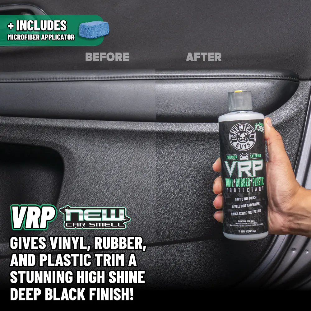includes VRP (Vinyl, Rubber, and Plastic) protectant, which restores a deep black look, enhances shine, and protects surfaces against harmful UV rays. -