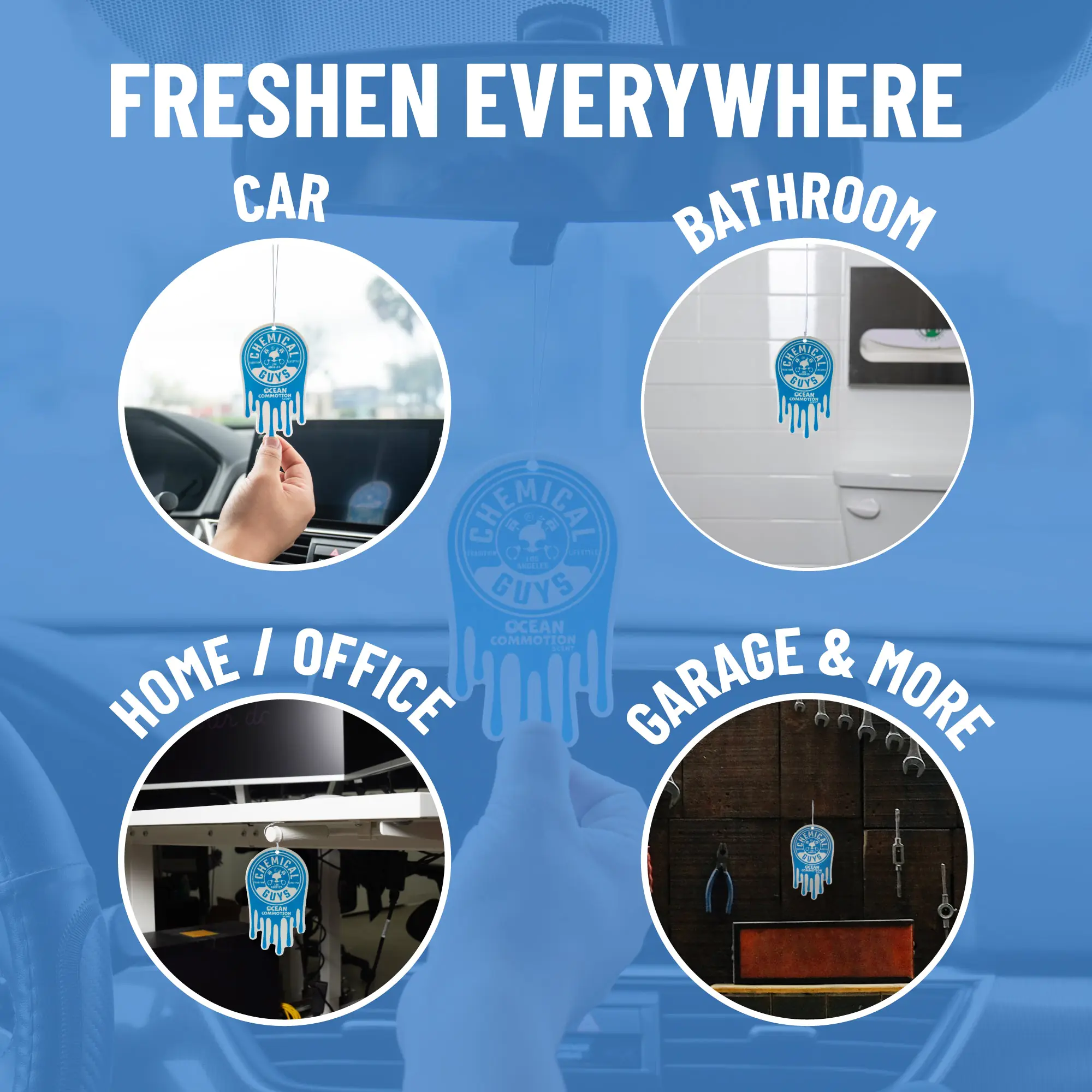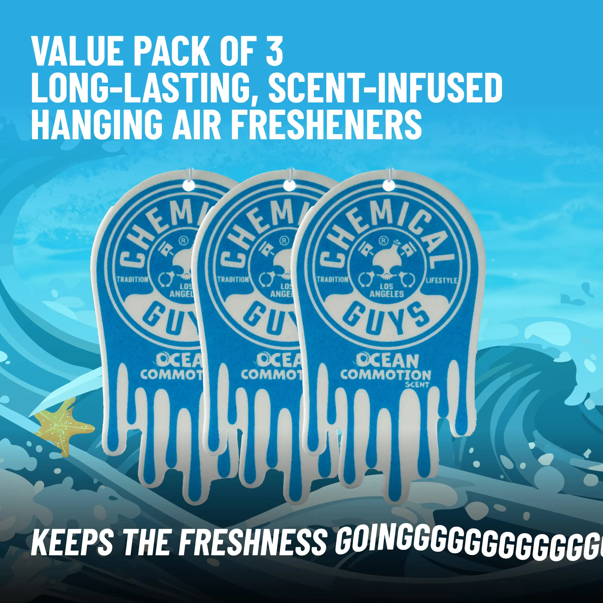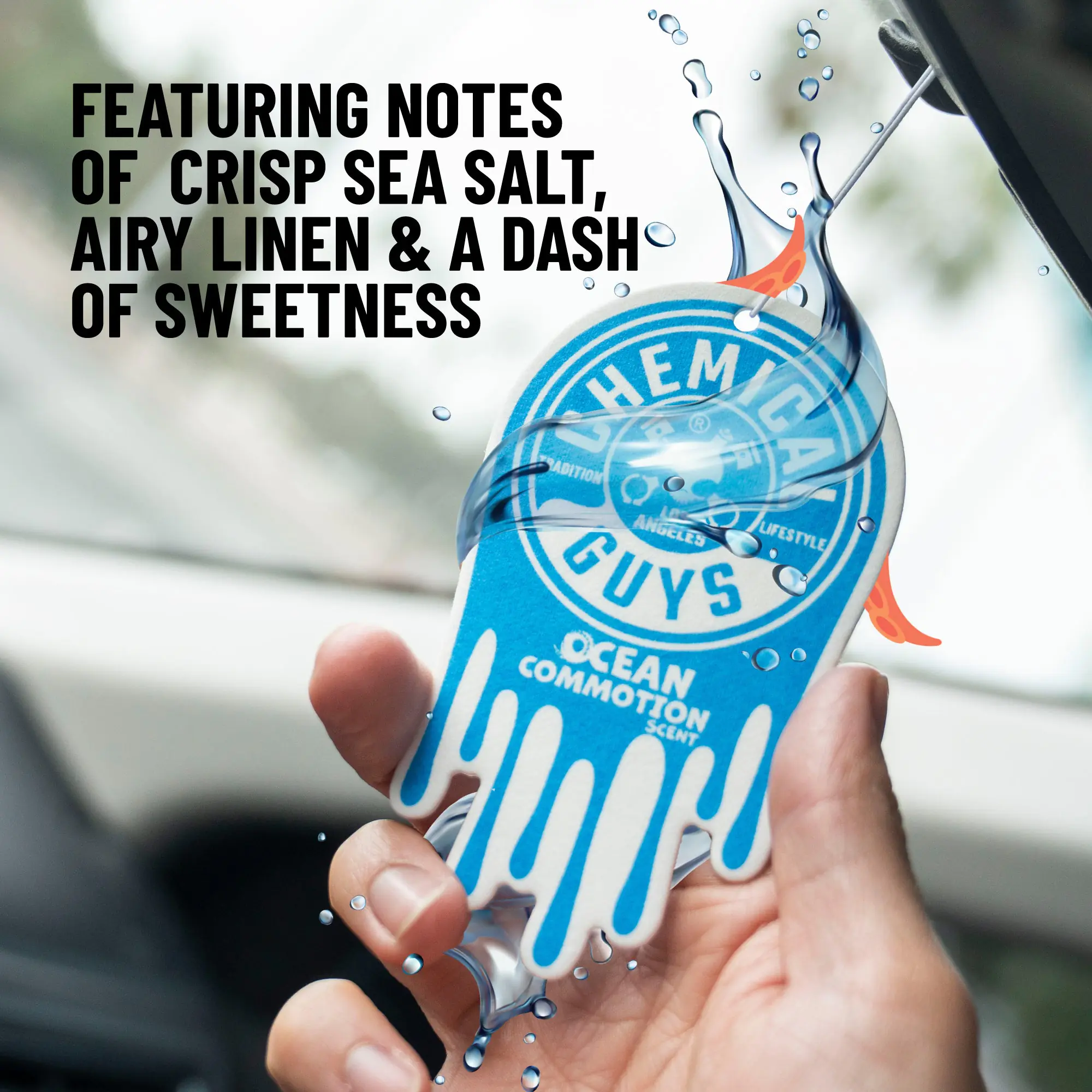 Chemical Guys Ocean Commotion Air Freshener turns every ride into a refreshing coastal getaway with the scent of crisp sea salt, airy linen, and a dash of sweetness – it’s like a mini beach vacation every time you drive.