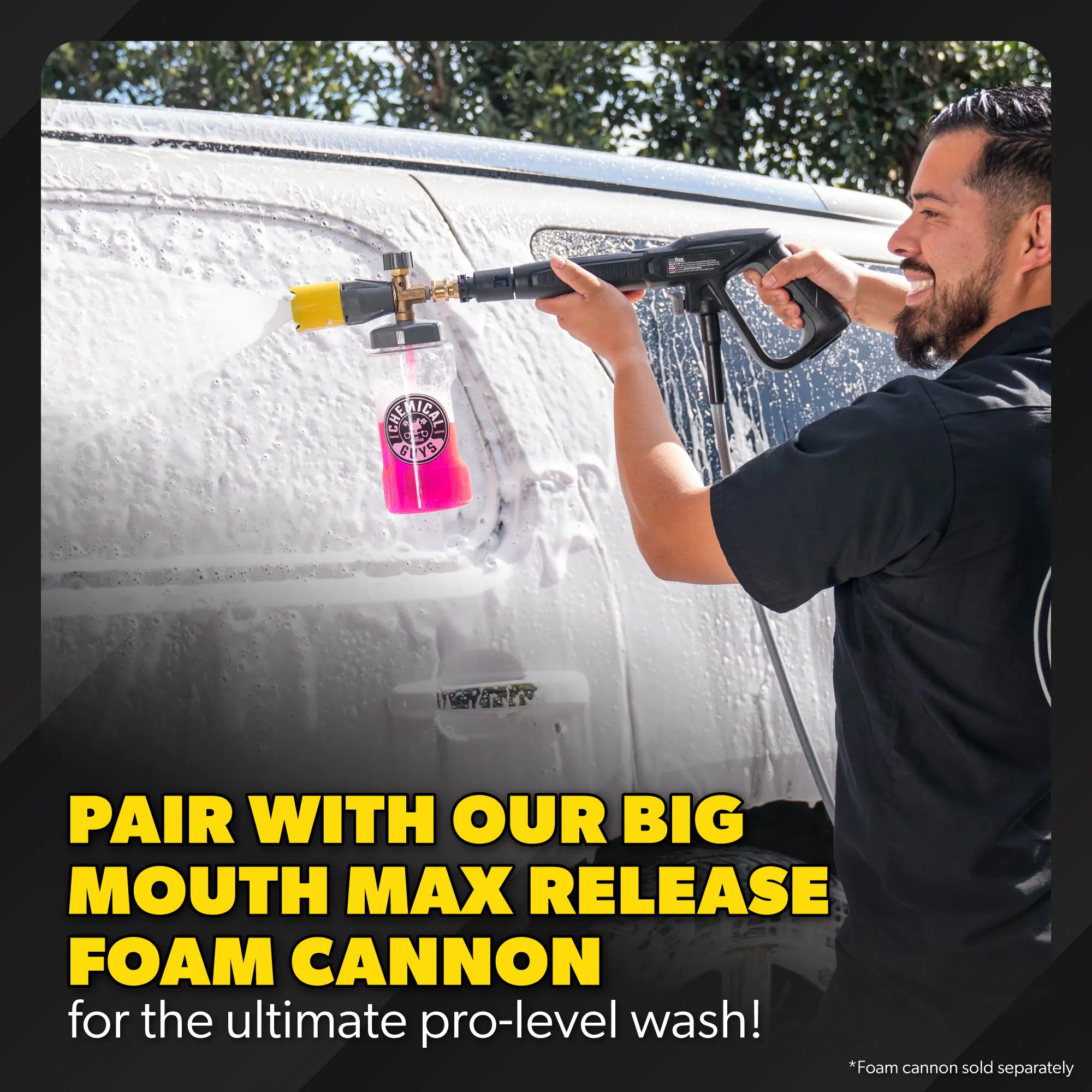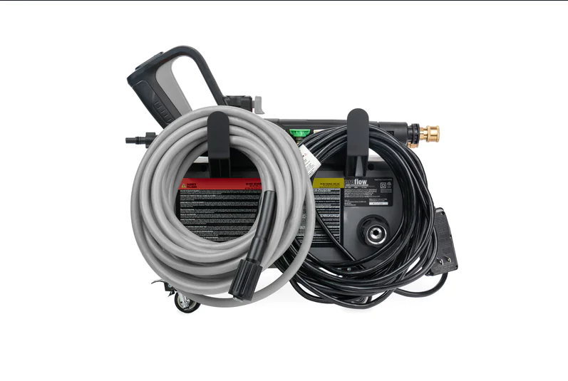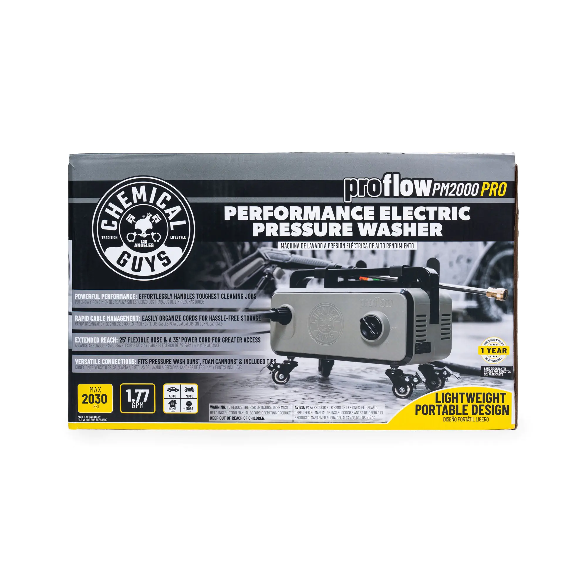 Compact and powerful, the all-new and improved ProFlow PM2000 Pro delivers up to 2030 PSI and 1.77 GPM for serious cleaning. Now upgraded with enhanced motor performance, flexible 25’ hose, pre-installed caster wheels, universal connections, and a detachable cable management and accessory holder, to keep your hose, power cord, gun, gun extension, and washer tips neatly secured.