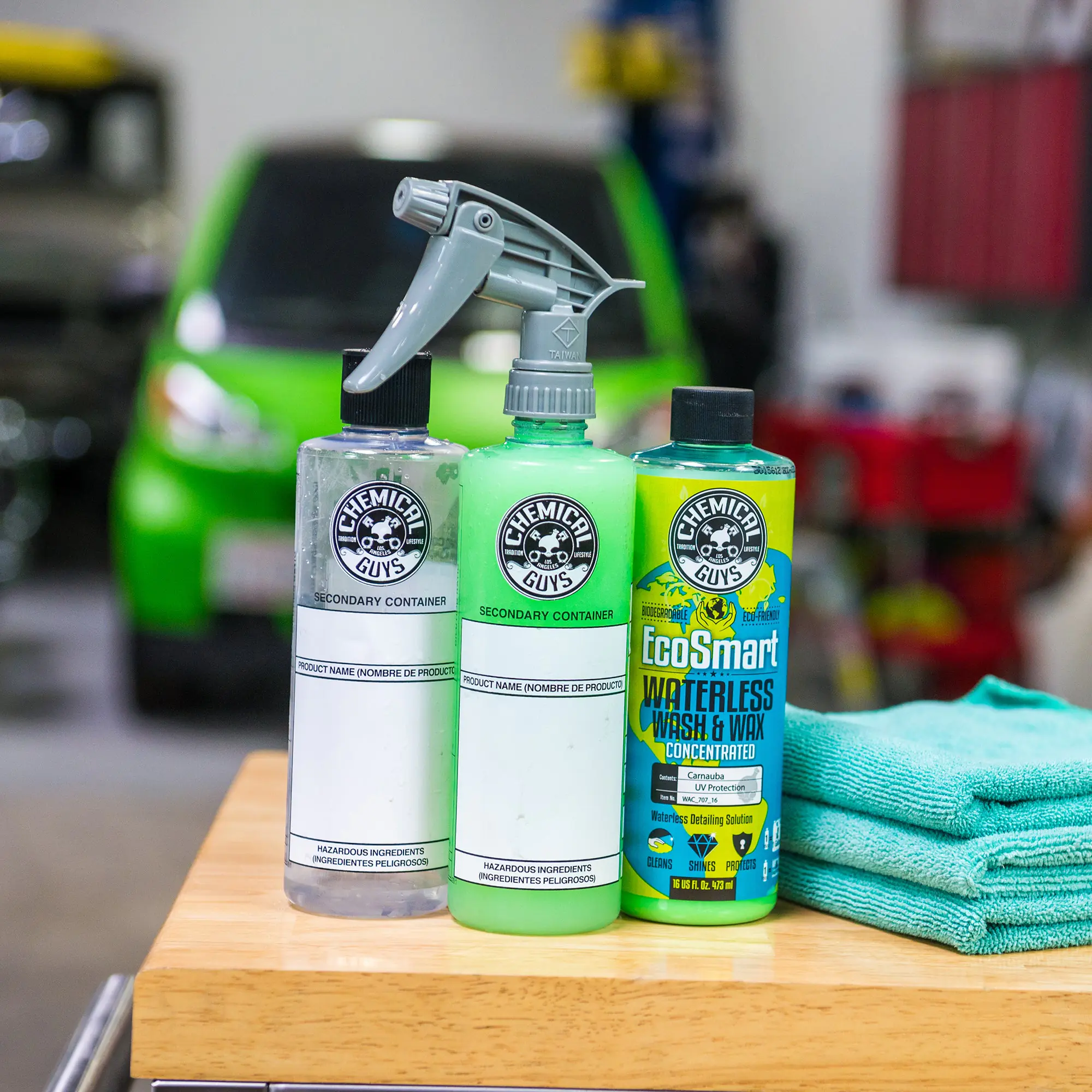Chemical Guys Secondary Container Bottle helps you mix, dilute, and easily identify the products you want at hand. Plus, it has convenient labels for product names, dilution ratios, and hazard communication. Write directly on the label to take away any guesswork and ensure fast, smooth detailing.