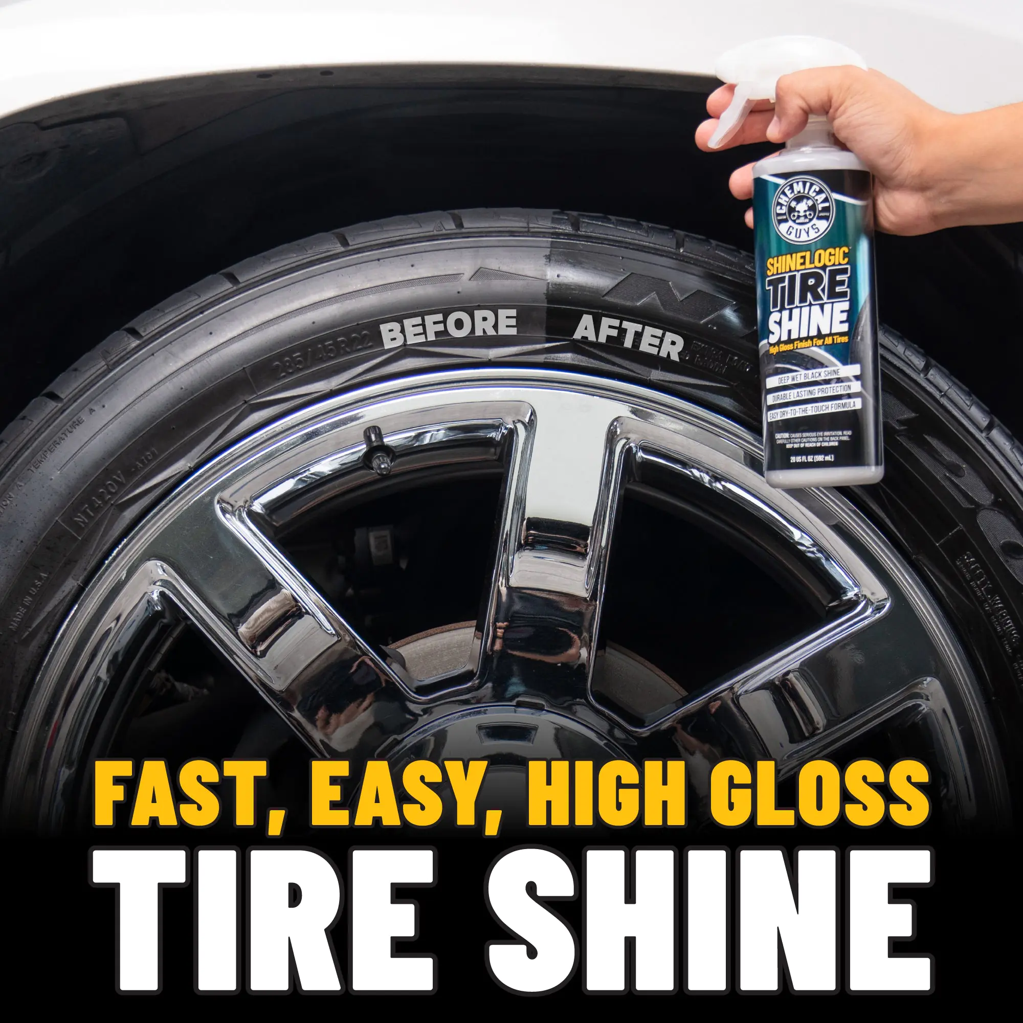 Achieve a glossy black finish with ShineLogic™ tire shine for a long-lasting, eye-catching look. -