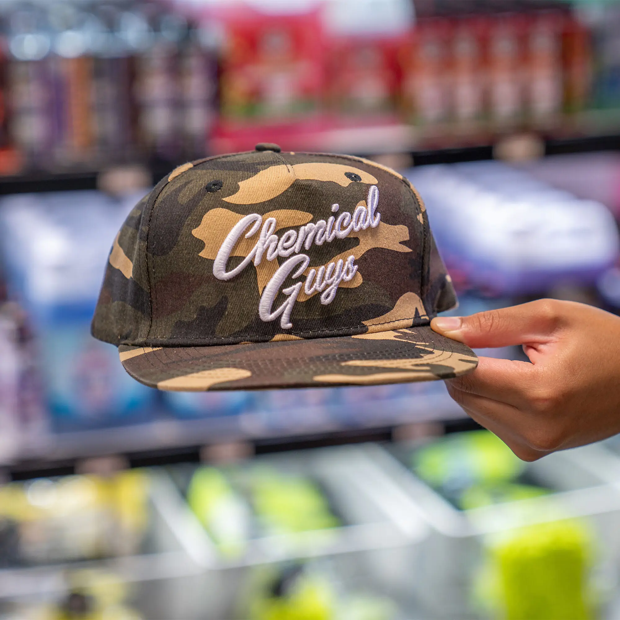 With the Snap-It-Back Camo Script Hat your personal style will look as good as the rides you detail! The stylish camouflage design sports the signature Chemical Guys Script logo on the front that lets everyone know just where you get your shine from. The snapback closure allows you to adjust the size of the strap and customize it to your head for the perfect fit, so no matter your head size, you can freshen up your fashion and maximize your style with this bold hat! Whether you’re hard at work giving your ride a signature shine or kicking back with friends after a long week, the Snap-It-Back Camo Script Hat will have you looking good!