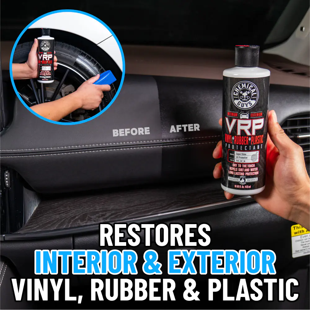 Restores deep black shine and protects against UV rays—easy-to-use for all vinyl, rubber, and plastic!