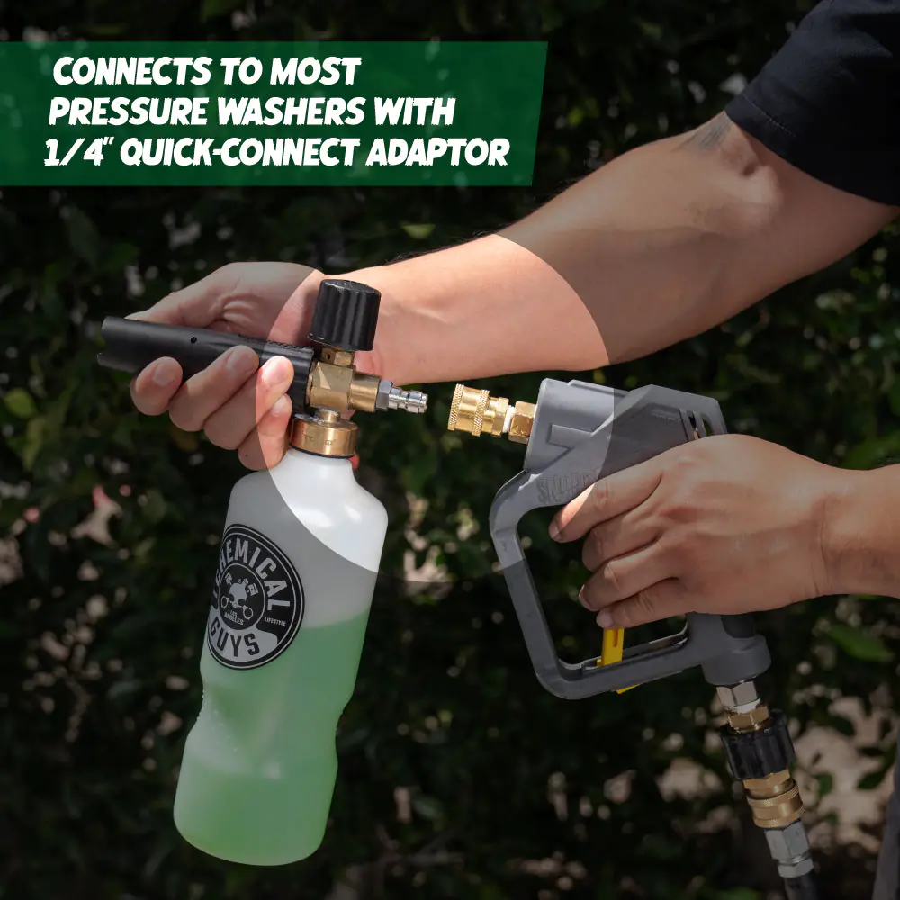 The solid brass components of the TORQ Max Foam 8 resist harmful corrosion, while its high-quality plastic parts reject harmful UV rays that can cause cracks and breaks. Units ship with a standard ¼’’ Quick-Connect adaptor that directly attaches the Foam Cannon to the pressure washer wand. It also features the patented TORQ Threadlock System on the threads, saving bottles from early wear and tear.
