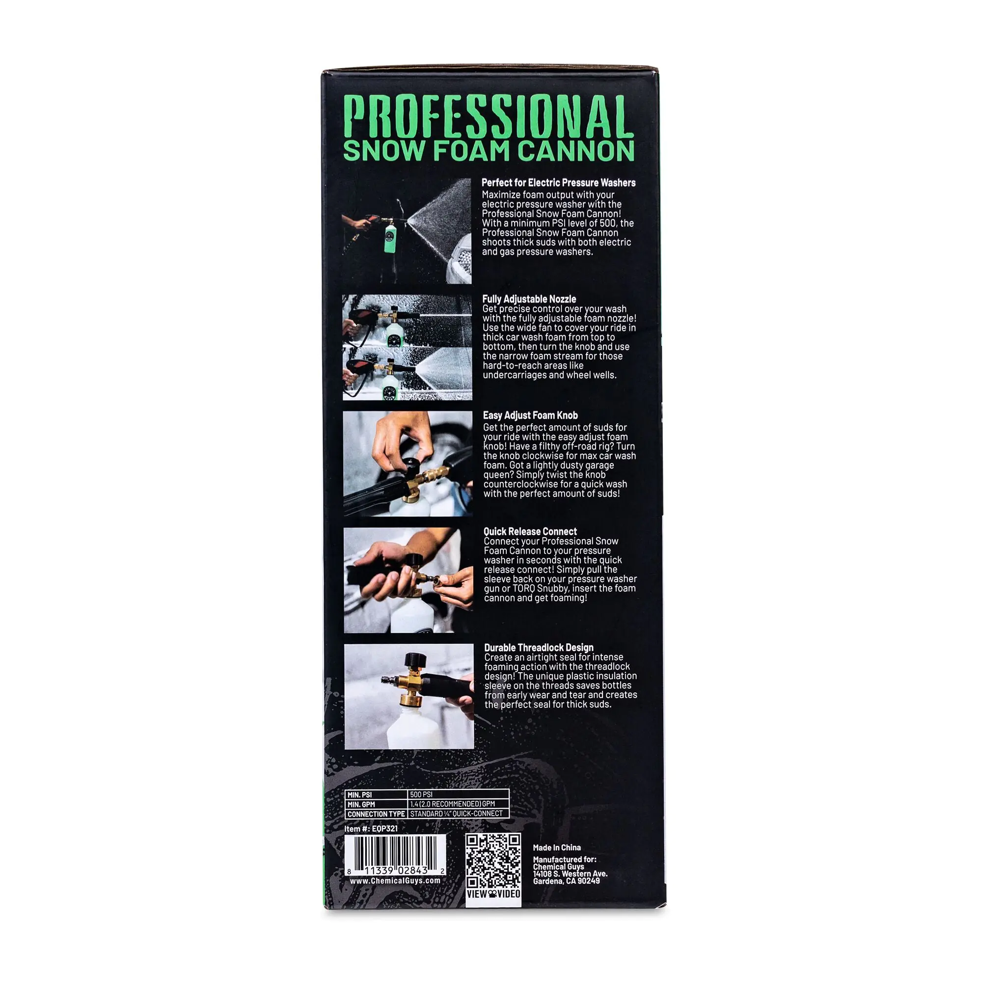 The Professional Snow Foam Cannon works with any gas or electric pressure washer 500-3,500 PSI. Never exceed 4,200 PSI with either cannon. Minimum 1.4 GPM; 2.0 GPM recommended; Never Exceed 5.3 GPM. Units ship with a standard ¼’’ Quick-Connect Plug Quick Release that directly attaches Foam Cannon to pressure washer wand.