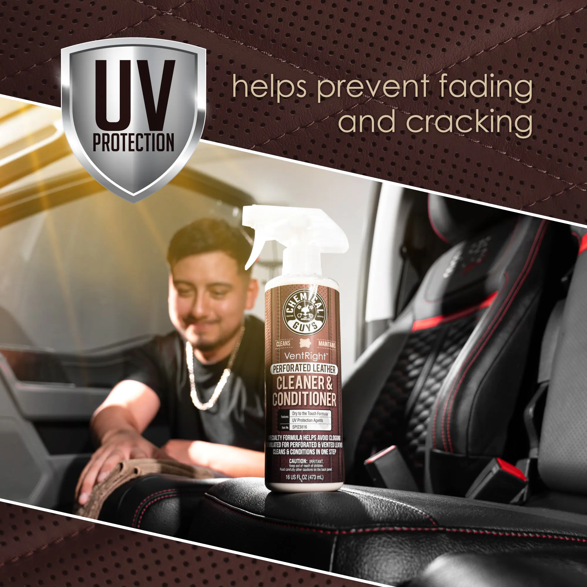 Keeping your perforated leather protected from sun damage helps it maintain its premium look and feel. VentRight helps leather resist damage from sun exposure by leaving behind a layer of UV protection with every use. This added defense helps surfaces resist fading and cracking, helping them maintain their high-end appearance over time. By combining maintenance cleaning, conditioning, and UV protection into one easy-to-use product, VentRight helps keep seats, steering wheels, door panels, and other leather surfaces looking and feeling their best.