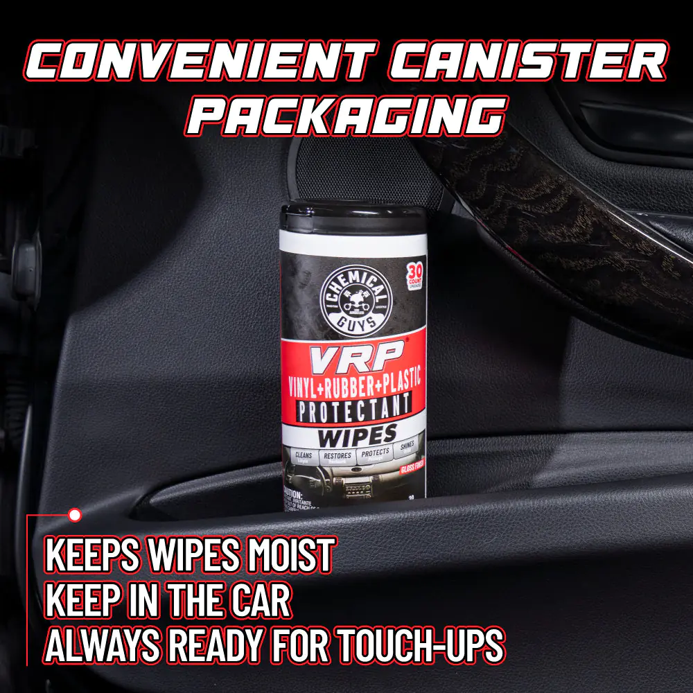 Chemical Guys VRP Wipes simplify the task of cleaning, restoring, and protecting your vehicle’s vinyl, rubber, and plastic surfaces. These convenient, pre-moistened wipes also deliver a deep, lasting shine. Perfect for use on dashboards, door panels, and vinyl seats, VRP Wipes are your go-to solution for achieving a perfect non-greasy, dry-to-the-touch glossy finish!