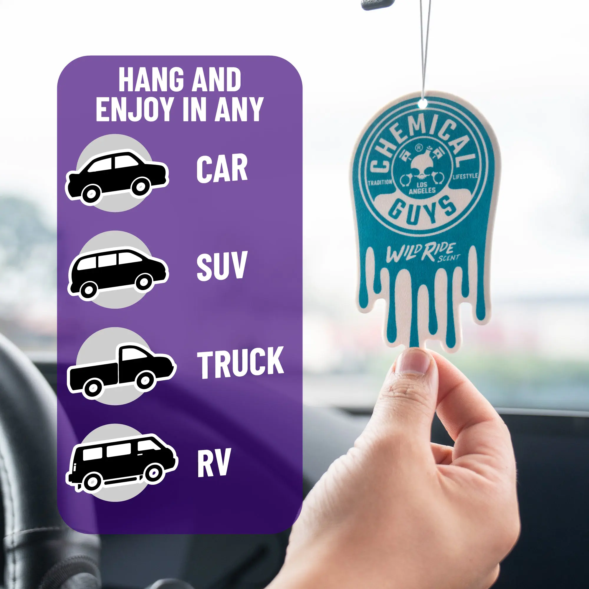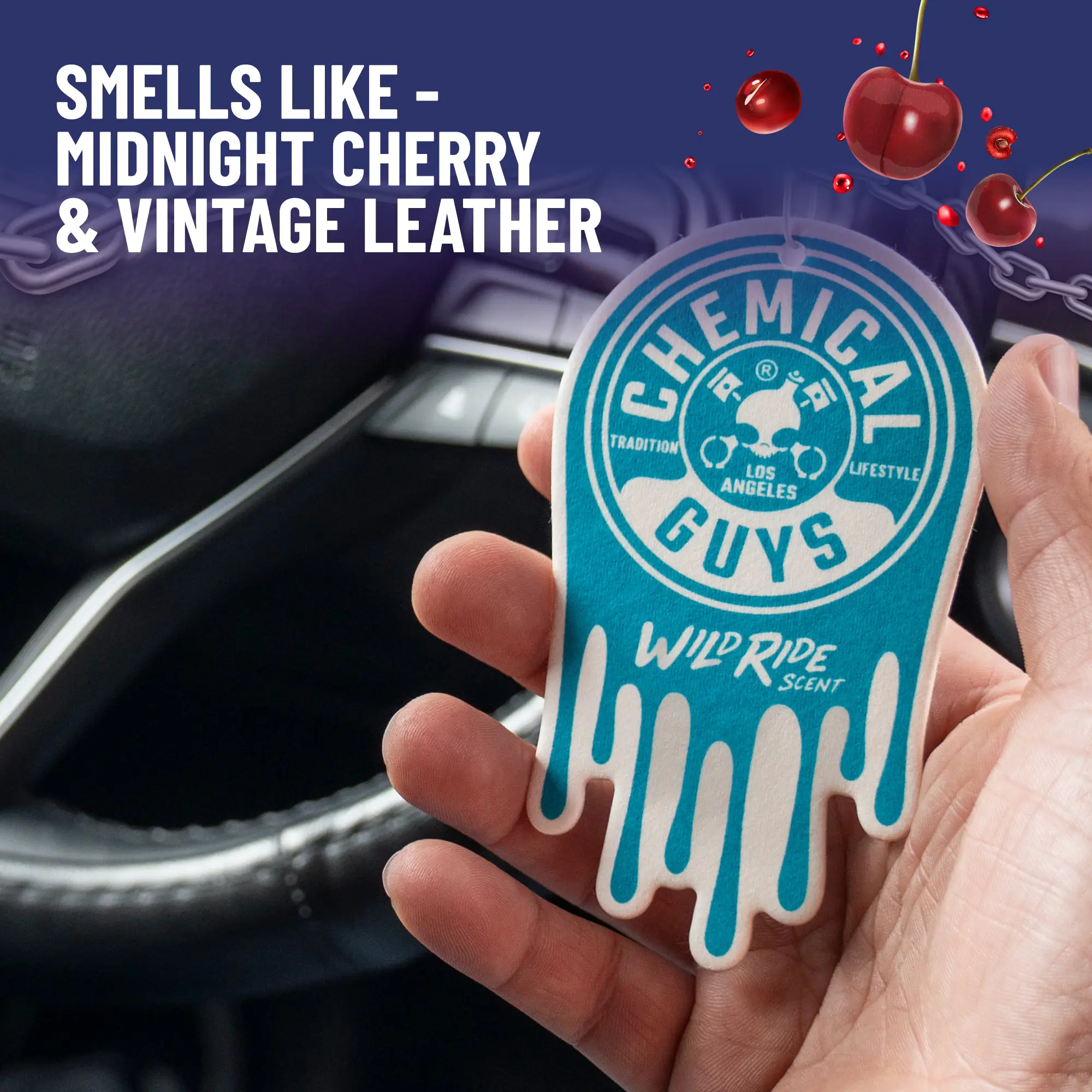 Chemical Guys Wild Ride Hanging Air Freshener is infused with a bold midnight cherry and vintage leather aroma that screams adrenaline and adventure; this exhilarating scent evokes the excitement of late-night escapades and adventure.