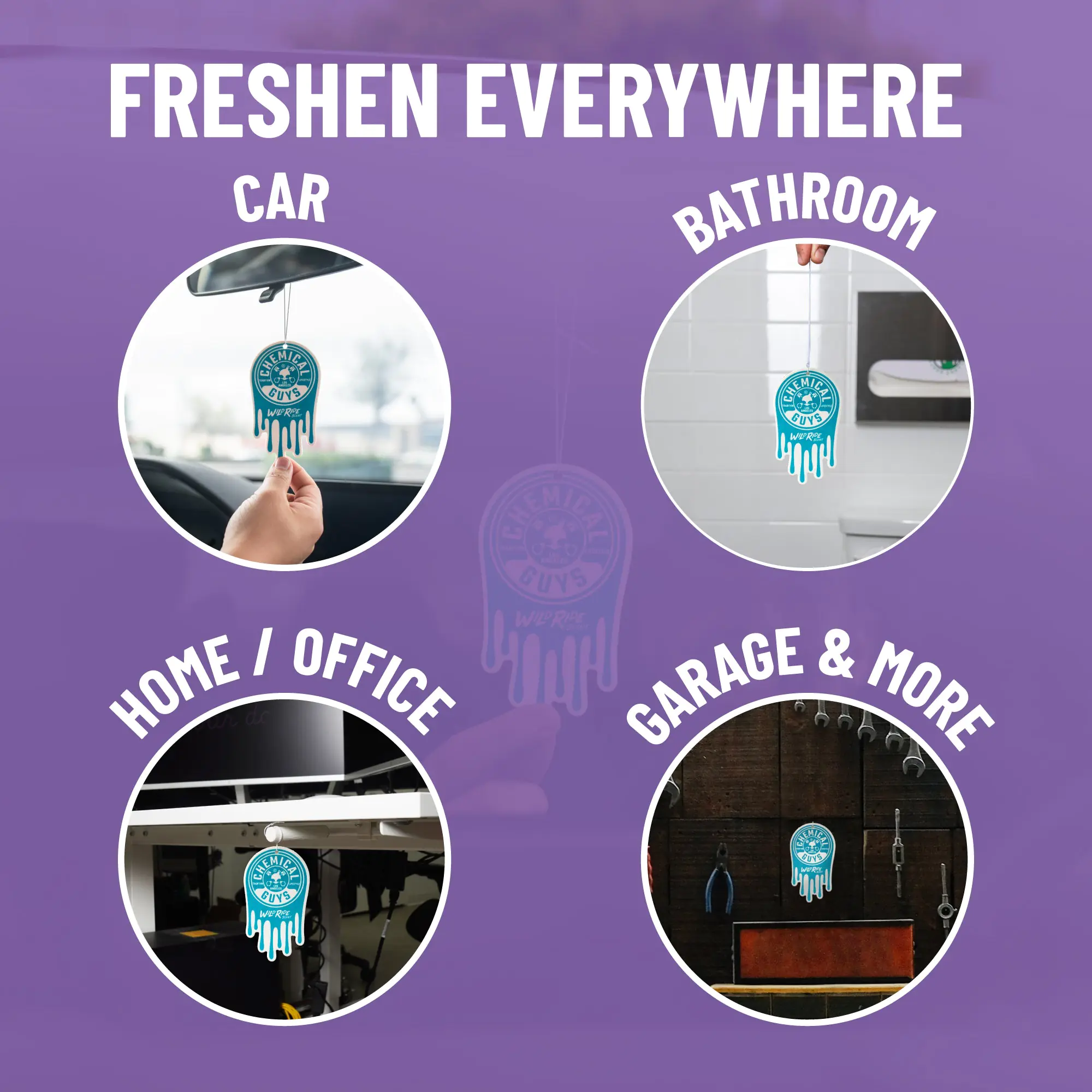 Featuring the iconic Chemical Guys logo with an eye-catching dripping design in bold electric teal, these hanging air fresheners that look great anywhere you hang them.